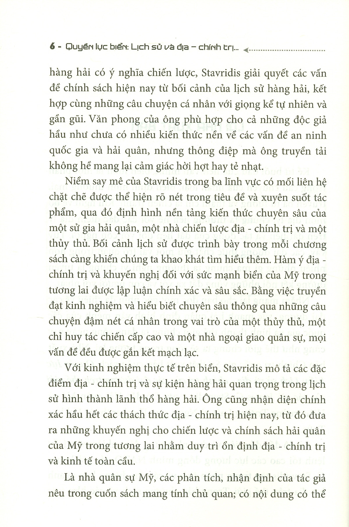 Được chấp bút bởi một trong những đô đốc được ngưỡng mộ nhất trong thế hệ của ông, và cũng là đô đốc duy nhất giữ chức Tư lệnh tối cao các lực lượng đồng minh NATO, Đô đốc James G. Stavridis đã có một hành trình đáng chú ý qua tất cả các vùng biển quan trọng nhất trên thế giới, mang lại cho chúng ta một góc nhìn đa chiều về các đại dương, sức mạnh hải quân định hình vận mệnh của các quốc gia và hình thành nên thế giới mà chúng ta đang sống ngày nay cũng như thế giới mà chúng ta sẽ sống trong tương lai. Bên cạnh đó, Quyền lực biển còn là một biên niên sử thú vị về hải quân, cho chúng ta cái nhìn sâu sắc về những cuộc giao tranh vĩ đại trên biển, từ Trận Salamis, Hải chiến Lepanto, Trận chiến Đại Tây Dương cho tới các cuộc xung đột tàu ngầm trong Chiến tranh lạnh. Ông cũng đưa ra những phân tích hết sức nhạy bén về các địa điểm có khả năng xảy ra các cuộc xung đột hải quân lớn trong tương lai, đặc biệt là Bắc Băng Dương, Đông Địa Trung Hải và Biển Đông.