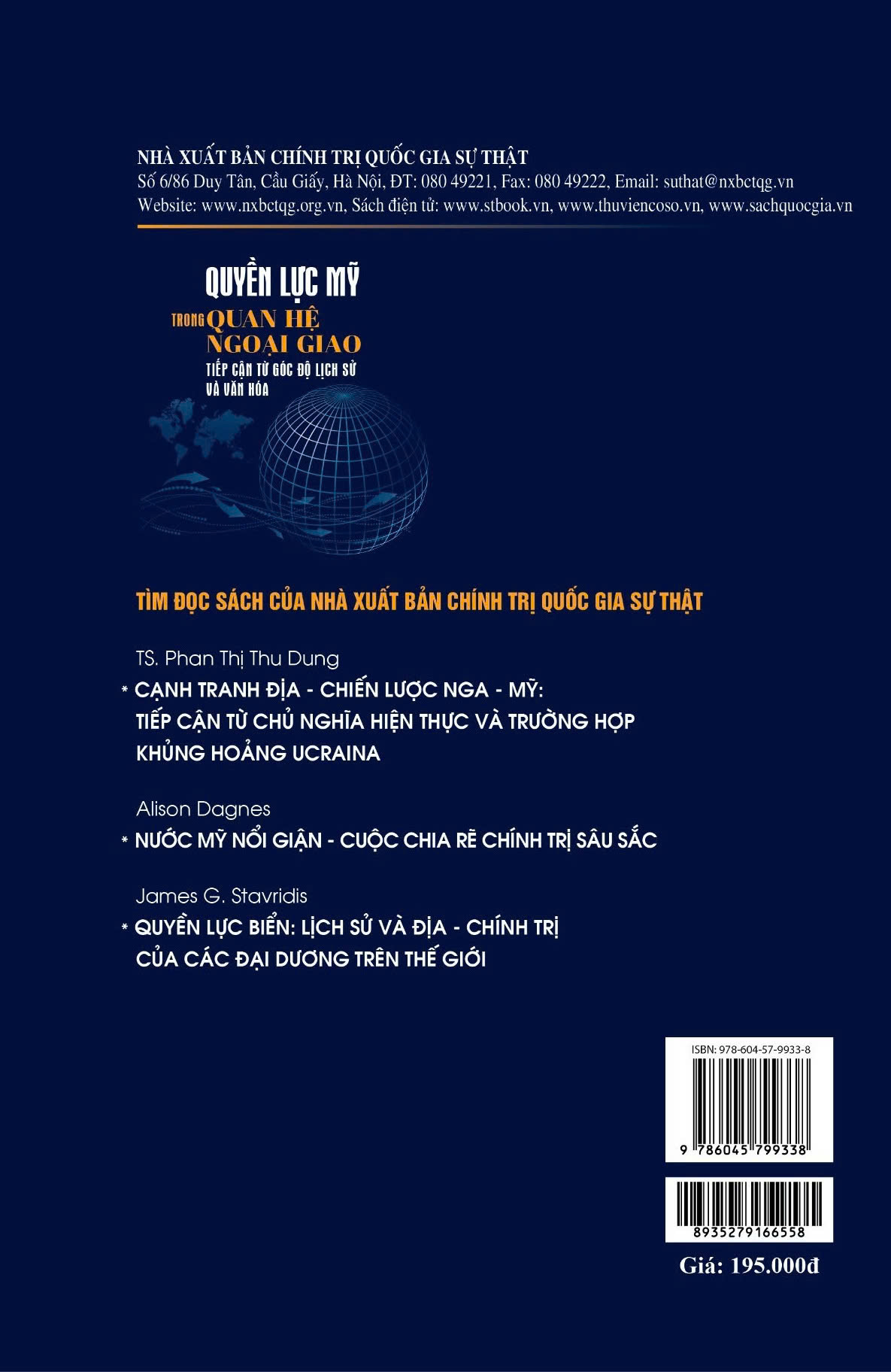 Nhằm đáp ứng nhu cầu tìm hiểu của bạn đọc về cách thức Mỹ mở rộng quyền lực và sức ảnh hưởng của mình trong quan hệ đối ngoại, Nhà xuất bản Chính trị quốc gia Sự thật xuất bản lần thứ hai, có chỉnh sửa, bổ sung nội dung cuốn sách Quyền lực Mỹ trong quan hệ ngoại giao: Tiếp cận từ góc độ lịch sử và văn hóa do PGS.TS. Đặng Cẩm Tú và GS.TS. Nguyễn Thái Yên Hương đồng chủ biên. Với cách tiếp cận từ lý luận đến thực tiễn, nội dung cuốn sách được bố cục thành ba chương, xem xét vấn đề quyền lực qua nhiều học thuyết trong quan hệ quốc tế, làm rõ nhận thức, quan niệm của người Mỹ về quyền lực và cách thức nước Mỹ mở rộng quyền lực trên toàn cầu. Trên cơ sở phân tích những bằng chứng thực tiễn, nhóm tác giả chỉ ra các nhân tố tác động đến phương thức Mỹ sử dụng quyền lực trong quan hệ đối ngoại, từ đó dự báo một số xu hướng mà siêu cường này sẽ triển khai nhằm duy trì và mở rộng ảnh hưởng trong quan hệ quốc tế.