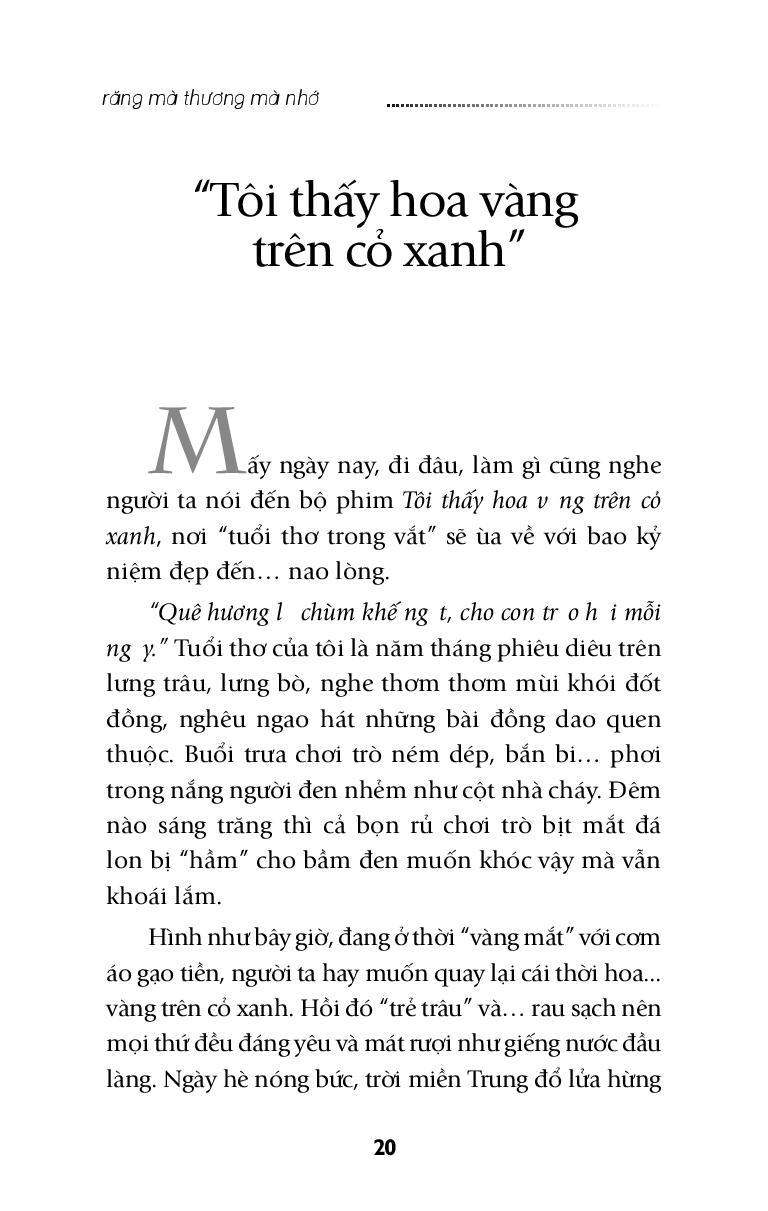 Răng Mà Thương Mà Nhớ Quê nhà của tôi trước mặt là núi non xanh mướt tầm mắt, phía sau có dòng sông nhỏ êm ả, hiền hòa quanh năm. Những buổi trưa trên đường đến trường, cả đám trẻ tranh thủ loi nhoi ngụp lặn trong dòng nước trong veo, mát rượi. Cứ tưởng mọi kỷ niệm xa ngái của thời đi học: bắn bi, đánh lộn, tắm sông, mót khoai, sợ ma... cùng biết bao trò chơi trong không gian thoáng đãng của đêm trăng quê hương sẽ không bao giờ còn được gặp lại nữa. Thời gian và công việc ở phố như dòng thác cuốn trôi tuổi thơ của tôi lạc mất lúc nào không biết, chỉ còn lại đây đó nỗi nhớ thương ray rứt khôn nguôi mỗi lúc đêm về, vậy mà... Những trang viết về một thời đèn sách, rung động đầu đời của tuổi mới lớn và cao cả nơi ấy là tình cảm gia đình, quê hương... bỗng nhiên ùa về, từng con chữ như thao thức với thời gian để mỗi khi đọc lại cứ thấy lòng rưng rưng. Răng mà thương mà nhớ là cảm xúc rất thật, trong đó đa phần các câu chuyện đều xảy ra từ cuộc sống hàng ngày cùng bao trăn trở, lo toan, suy nghĩ... chỉ mong sao chạm đến được một phần nào trái tim luôn bao dung và sự đồng điệu của độc giả để chúng ta cùng nhau hoài niệm và bồi hồi tìm lại những... ngày xưa.