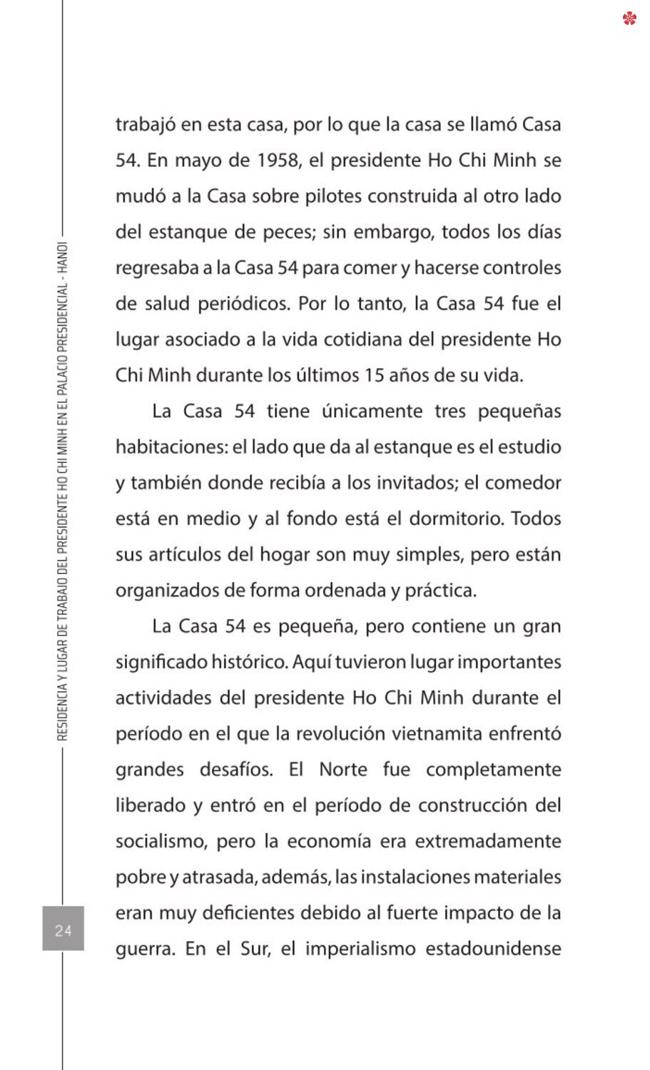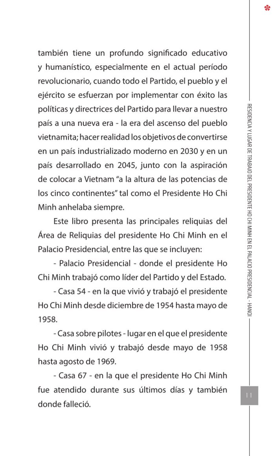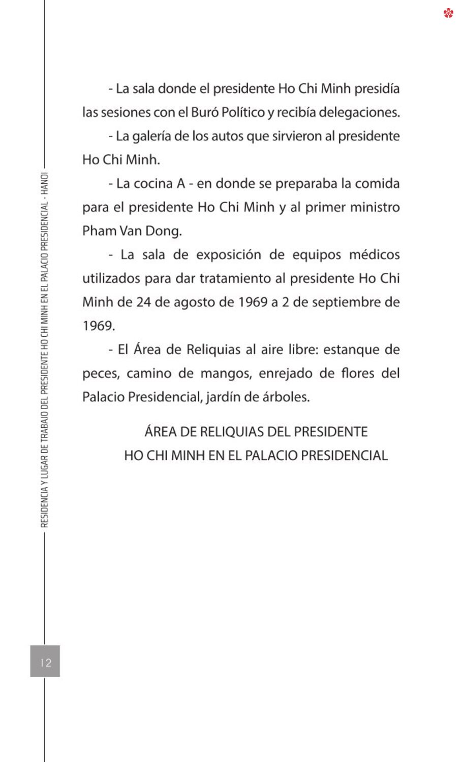 El libro Residencia y lugar de trabajo del presidente Ho Chi Minh en el Palacio Presidencial - Hanoi ofrece a los lectores un recurso valioso que nos ayuda a comprender mejor la vida del amado líder del de la nación vietnamita. El libro recrea de forma realista y lleva al lector a cada pequeño rincón, a cada recuerdo, a cada historia sencilla pero impregnada de significado histórico y humano sobre los lugares asociados al presidente Ho Chi Minh en el Palacio Presidencial como: la Casa 54, la Casa sobre pilotes, la Casa 67, el estanque de peces, el camino de mangos, lentre otros.
