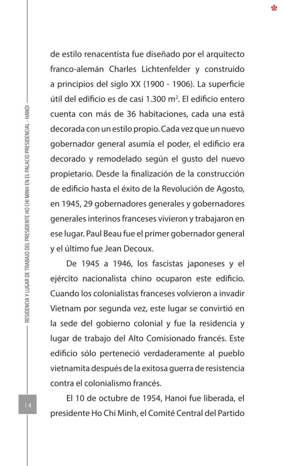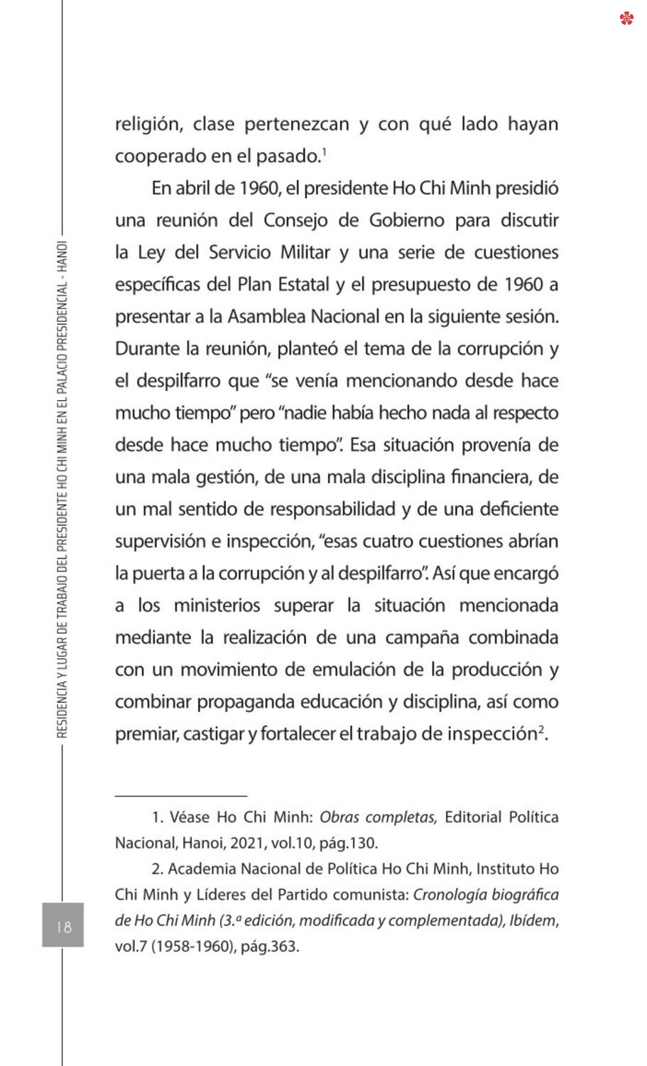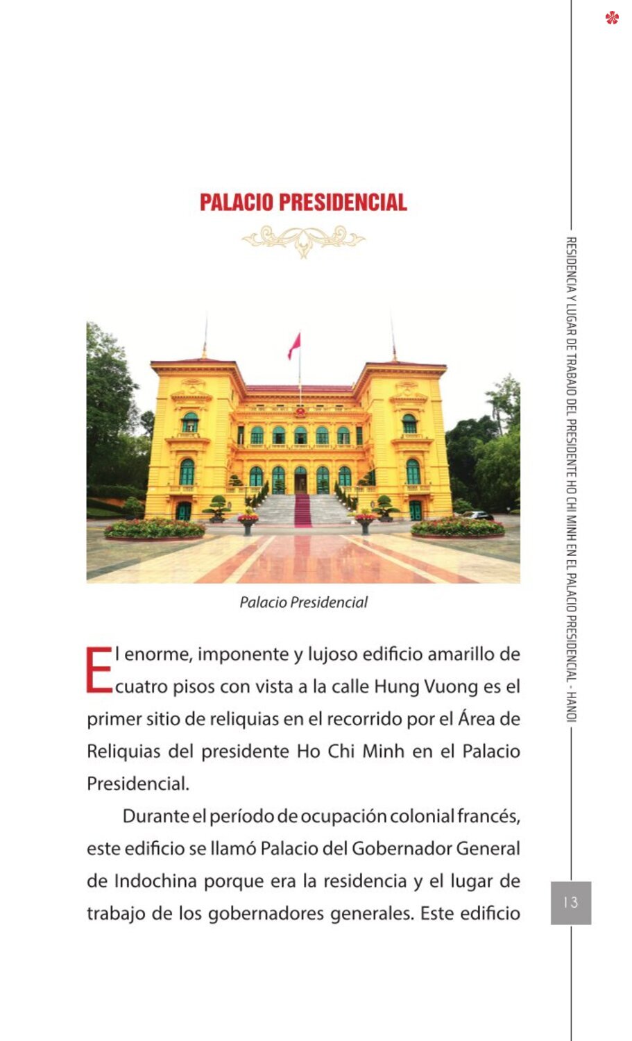 El libro Residencia y lugar de trabajo del presidente Ho Chi Minh en el Palacio Presidencial - Hanoi ofrece a los lectores un recurso valioso que nos ayuda a comprender mejor la vida del amado líder del de la nación vietnamita. El libro recrea de forma realista y lleva al lector a cada pequeño rincón, a cada recuerdo, a cada historia sencilla pero impregnada de significado histórico y humano sobre los lugares asociados al presidente Ho Chi Minh en el Palacio Presidencial como: la Casa 54, la Casa sobre pilotes, la Casa 67, el estanque de peces, el camino de mangos, lentre otros.