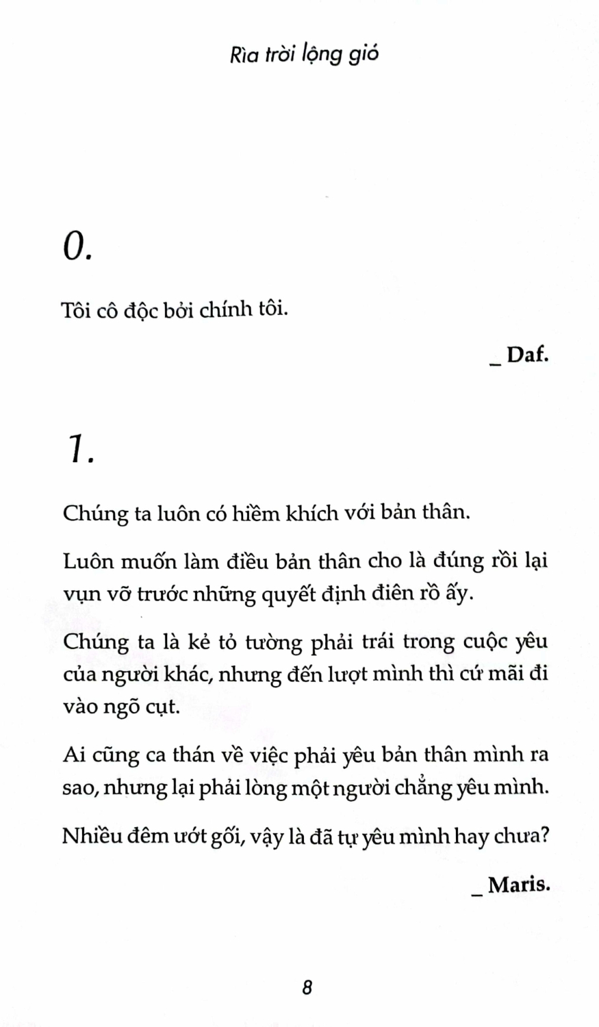 Liệu bạn có thấy chính mình trong những dòng tự sự đầy day dứt trên? Vậy nhất định đừng bỏ lỡ cuốn sách “Rìa trời lộng gió” - ấn phẩm mới nhất của nhóm tác giả trẻ Monologue. Xuyên suốt 232 trang sách, Daf, R, Cam và Maris - 4 tác giả, 4 cá tính - đã cùng nhau dệt nên bức tranh nội tâm đầy sắc thái của tuổi trẻ, nơi tình yêu là gam màu chủ đạo, nhưng không phải là tất cả. Qua từng trang viết đầy tính chạm và những nhân vật xuất hiện trong cuốn sách, bạn sẽ tìm thấy đâu đó dáng vẻ quen thuộc của mình, với những rung động đầu đời, những vấp ngã đầu tiên trong tình yêu, và cả những nỗi đau không thể nói thành lời. Nhưng bạn biết không? Trên con tàu tuổi trẻ, tình yêu quả thực là một món hành lý quá sức quan trọng và đáng dốc lòng để giữ chặt. Nhưng sau cùng bạn sẽ nhận ra, tình yêu đôi khi chỉ xuất hiện trong một chặng đường, nó có thể đến và đi khi thời điểm vào thời điểm thích hợp, để lại cho ta bài học về sự trưởng thành…