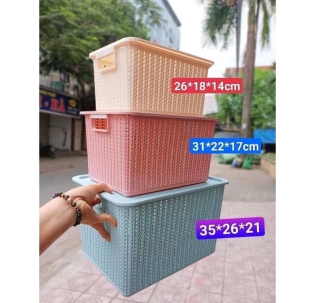 - Kích thước: lựa chọn có nắp + Rổ đan bé (MS: 3415-1): 27x19x14 ( có nắp ) + Rổ đan trung (MS: 3415-2): 31x22x18 ( có nắp ) + Rổ đan đại (MS: 3415-3): 36x26x21 ( có nắp )