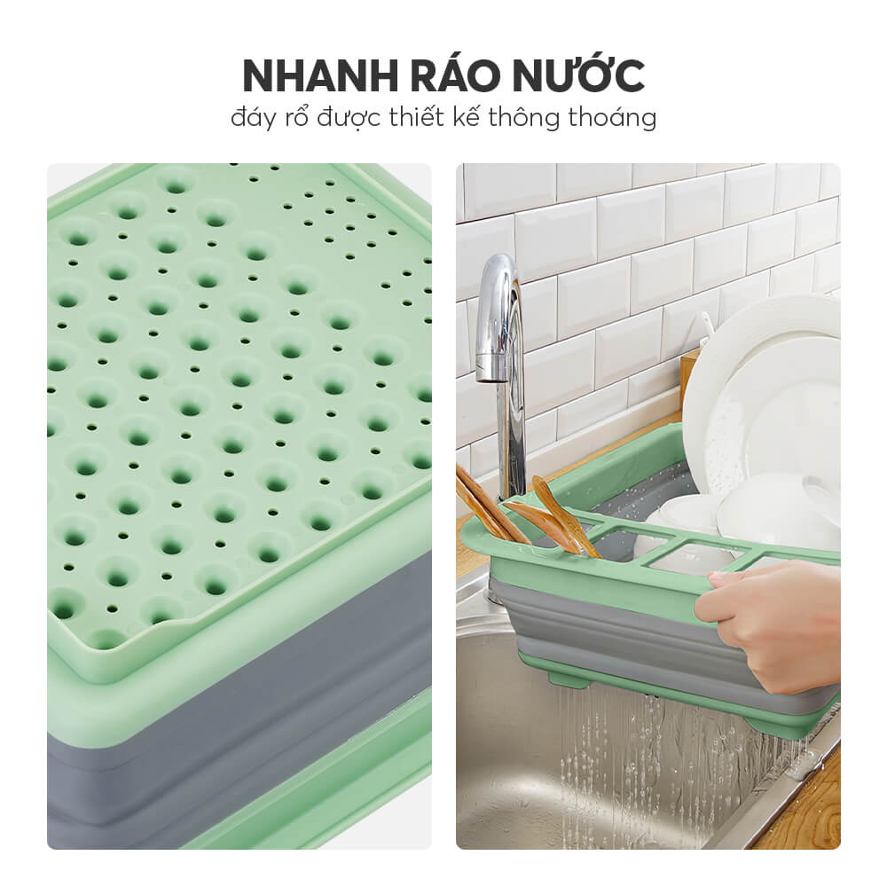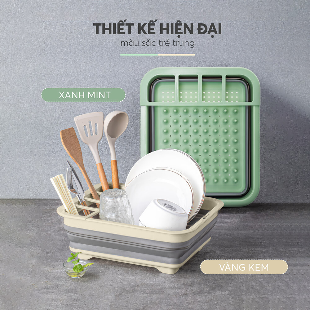 Rổ gác bồn rửa bát gấp gọn lúa mạch: – Bồn rửa rau, rửa bát thường có thiết kế 2 bồn khá tiện lợi nhưng có 1 điều khá là bất cập mà chắc chắn