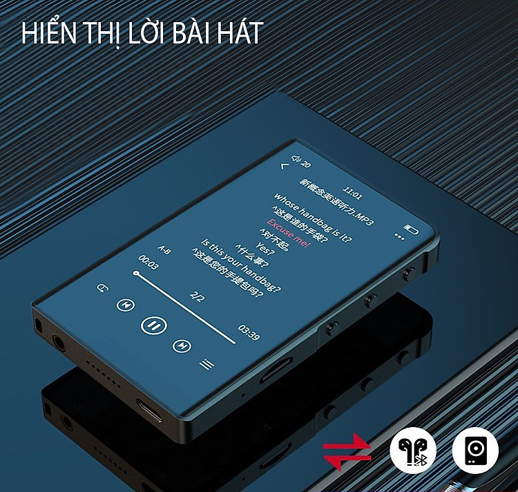 Máy nghe nhạc Ruizu X02B sử dụng công nghệ Bluetooth kết nối ổn định, hỗ trợ loa ngoài nghe nhạc, xem phim. Tính năng lặp đoạn A-B, thay đổi tốc độ phát hỗ trợ học