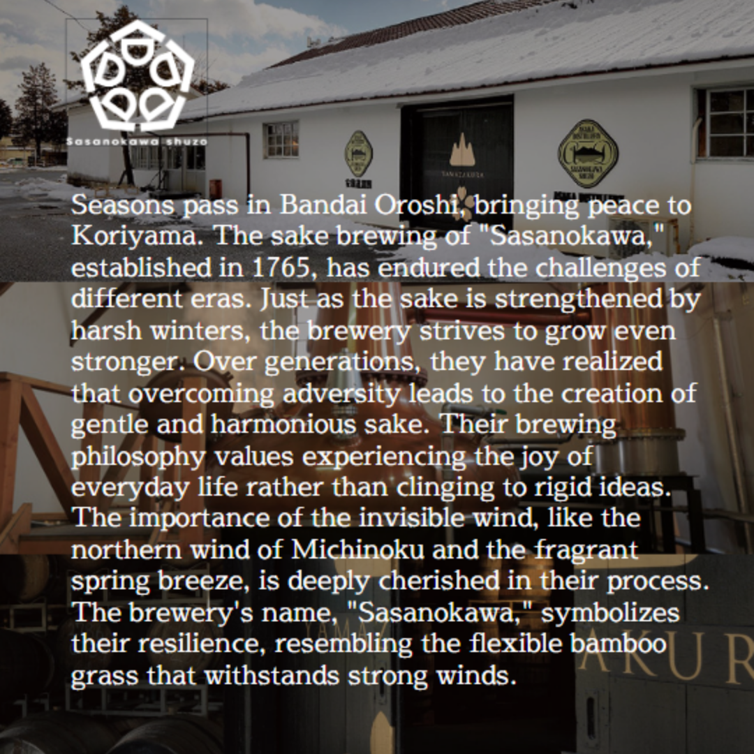 Được làm bằng 100% "Fukunoka" là loại gạo mới phù hợp để ủ rượu sake do tỉnh Fukushima sản xuất, được lên men trong thời gian dài ở nhiệt độ thấp. Bạn có thể thưởng thức hương thơm và vị đậm đà đặc trưng của rượu sake gạo nguyên chất Sasanokawa, cũng như vị nhẹ và êm của nó. Loại rượu sake này mang hương vị đậm đà tuyệt vời của Junmai, cũng như dư vị thanh khiết, sảng khoái của Ginjo phảng phất hương thơm của chuối rất thú vị.