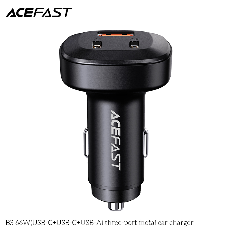 Bộ sạc ô tô ACEFAST B3, tổng công suất 66W, vật liệu thân bằng hợp kim nhôm, hỗ trợ hầu hết các giao thức sạc nhanh Thông số kỹ thuật: - Input: DC12-24V. - Output: USB-C1: 36W, USB-C2: 30W, USB-A: 30W, USB-C1 + USB-C2: 36W + 30W, USB-C1 + USB-A: 36W + 30W, USB-C1 + USB-C2 + USB-A: 5V / 5A. Hỗ trợ cho PD3.0, cho PPS, cho QC4.0, cho AFC, cho FCP, cho SCP và các giao thức sạc nhanh khác.
