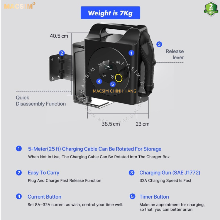 - 01 hộp caton chống sốc + 01 sách hướng dẫn sử dụng Bảo hành: Bộ sạc Macsim được thiết kế, phát triển và sản xuất một cách nghiêm ngặt, đồng thời bảo hành 2 năm theo tiêu chuẩn, giúp bạn yên tâm khi đầu tư. Bạn đi xe ô tô điện nhưng rất giống thợ sửa chữa điện nước, bởi trong xe ô tô của bạn lỉnh kỉnh bừa bộn đồ đạc dây dựa, dây tiếp địa lằng nhằng, bạn luôn phải gỡ rối dây sạc. Bạn cần một giải pháp và đang tìm kiếm bộ sạc ô tô điện gọn gàng tiện lợi an toàn, sạc tại nhà hoặc đi xa, với chức năng quấn gọn dây phích cắm, tích hợp sẵn tiếp địa, sạc có thể tự động phát hiện và điều chỉnh dòng 6A-10A-12A-16A phù hợp điện áp đang dùng, và các tính năng hữu dụng khác, thì sạc ô tô di động cao cấp macsim 3,68 kw 220v là sự lựa chọn tốt nhất trên thị trường sạc ô tô điện hiện nay.