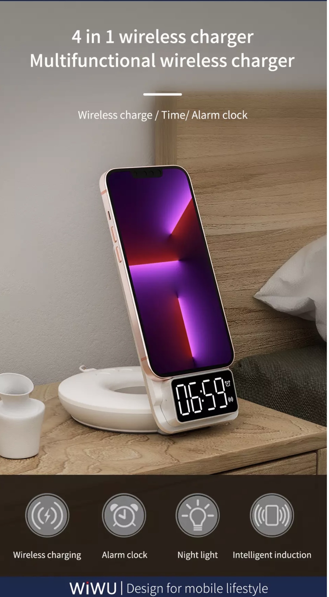 Sạc Wiwu Automatic Positioning 4 in 1 M11 Thương hiệu: Wiwu Mô tả sản phẩm - Chất liệu: hợp kim nhôm chất lượng cao và bền - Bộ sạc không dây 4 in 1 và là giá đỡ để bàn cho điện thoại - Hỗ trợ sạc không dây nhanh - Cuộn dây có thể tháo rời, ngang và dọc - Định vị chính xác - Sạc có chế độ đèn ban đêm ánh sáng dịu nhẹ và thoải mái - Xung quanh sạc ánh sáng ấm áp và sáng sủa - Điều chỉnh đa hướng sử dụng trong nhiều tình huống - Sạc có đồng hồ hiển thị giờ - Hỗ trợ cho tất cả các máy có chế độ sạc không dây. Bộ chuyển đổi dành cho di động 4.7- 6.9inch - Đầu ra: 5V = 3A 9V = 2.3A - Giao diện: loại C - Tỉ lệ đầu ra: 15W ( hỗ trợ 10W/7,5W,5W)