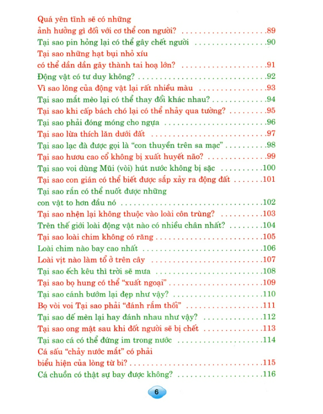 Các câu hỏi sẽ giúp các bạn tìm hiểu được vô số điều bổ ích từ thế giới muôn màu: Tại sao bóng đèn điện lại có thể phát sáng? Voi có phải là động vật lớn nhất không? Trai di chuyển như thế nào? Vì sao cá chuồn biết bay?