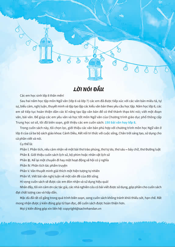 văn, bài văn. Để giúp các em yêu văn và học tốt môn Ngữ văn của Chương trình giáo dục phổ thông cấp Trung học sơ sở, tôi đã biên soạn, giới thiệu các em cuốn sách: 150 bài văn hay lớp 8.