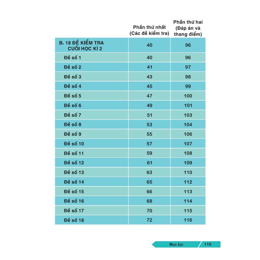 • Phần thứ nhất là các đề kiểm tra gồm 18 đề kiểm tra cuối học kì 1 và 18 để kiểm tra cuối học kì 2.