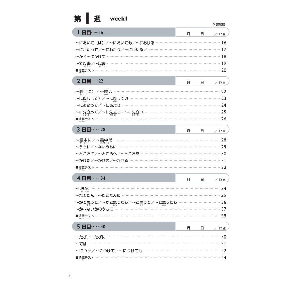 Các mẫu ngữ pháp được sắp xếp giúp dễ dàng ghi nhớ. Mỗi ngày, người học sẽ học từ 3 đến 5 mẫu ngữ pháp (6 trang sách) và sẽ hoàn thành trong 9 tuần. Bằng cách đặt các mẫu ngữ pháp có nghĩa tương tự và các mẫu ngữ pháp có khả năng gây nhầm lẫn vào trong cùng 1 bài, giáo trình giúp người học nắm vững một cách hiệu quả những điểm then chốt dễ bị hỏi trong kỳ thi thực tế. Ngoài ra, giáo trình cũng cung cấp “lộ trình học tập” giúp bạn có thể kiểm tra lại những kiến thức đã học.
