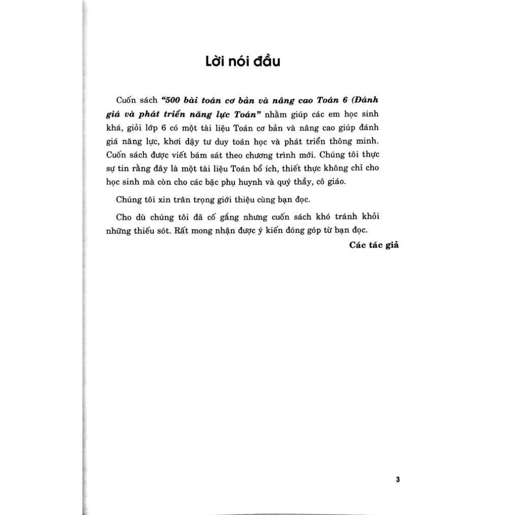 ====================== Cuốn sách "500 Bài Tập Cơ Bản Và Nâng Cao Toán 6 (Đánh Giá Và Phát Triển Năng Lực Toán)" nhằm giúp các em học sinh khá, giỏi lớp 6 có một tài liệu Toán cơ bản và nâng cao giúp đánh giá năng lực, khơi dậy tư duy toán học và phát triển thông minh. Cuốn sách được viết bám sát theo chương trình mới. Chúng tôi thực sự tin rằng đây là một tài liệu Toán bổ ích, thiết thực không chỉ cho học sinh mà còn cho các bậc phụ huynh và quý thầy, cô giáo.