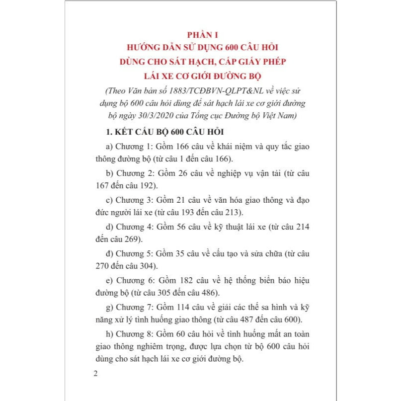 (Theo Văn bản số 1883/TCĐBVN-QLPT&NL về việc sử dụng bộ 600 câu hỏi dùng để sát hạch lái xe cơ giới đường bộ ngày 30/3/2020 của Tổng cục Đường bộ Việt Nam) 1. KẾT CẤU BỘ 600 CÂU HỎI