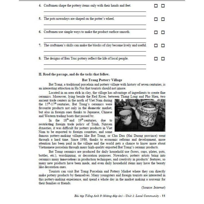 Bài tập dành cho mỗi đơn vị bài học gồm 6 phần: Pronunciation, Vocabulary, Grammar, Speaking, Reading, Writing và hai bài luyện tập Test 1 & 2 gồm 50 câu hỏi kiểm tra với bài tập phát triển các kĩ năng trên. Các bài Review giúp học sinh tự kiểm tra những nội dung kiến thức và rèn luyện các kĩ năng sau mỗi 3 đơn vị bài học.