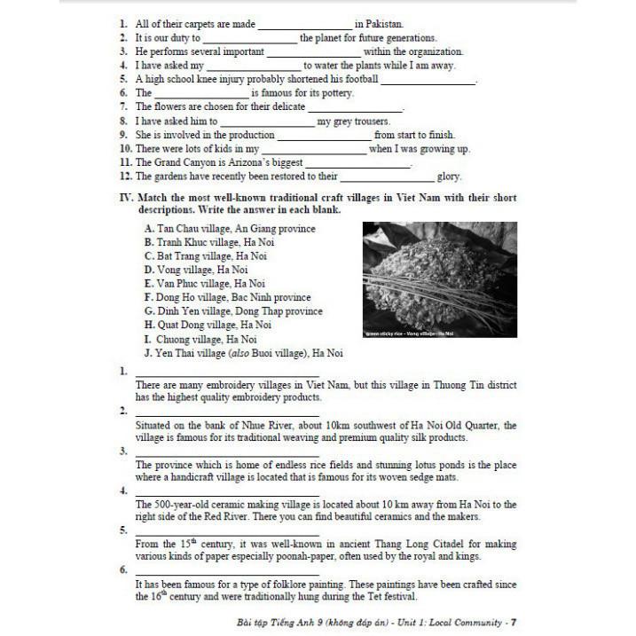 Cuốn sách Bài tập Tiếng Anh 9 – Không đáp án gồm 12 đơn vị bài học: Local community; City life; Healthy living for teens; Remembering the past; Our experiences; Vietnamese lifestyle: Then and now; Natural wonders of the world; Tourism; World Englishes; Planet Earth; Electronic devices; Career choices và 4 bài ôn tập Review.