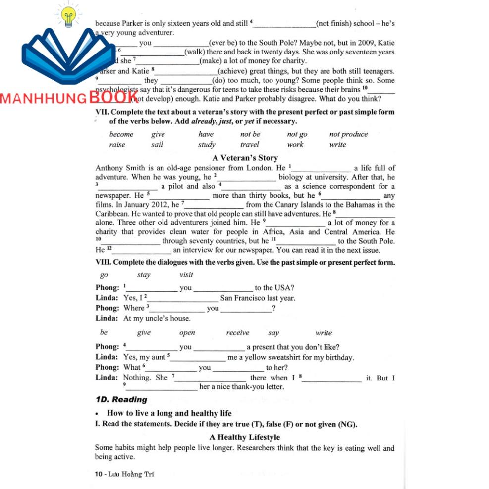 Bài tập dành cho mỗi đơn vị bài học gồm các phần sau: Vocabulary, Grammar, Word skills, Reading, Pronunciation, Speaking, và Writing.
