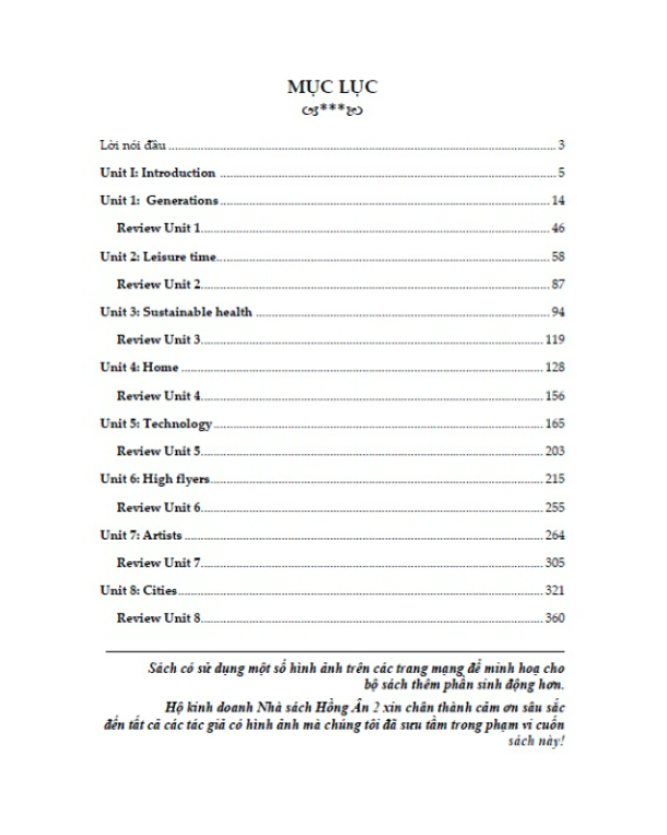 Bài tập Tiếng Anh 11 – Không đáp án gồm một bài ôn tập củng cố kiến thức đã học (Introduction), và 8 đơn vị bài học chính: Generations, Leisure time, Sustainable health, Home, Technology, High flyers, Artists, Cities. Sau mỗi đơn vị bài học đều có bài ôn tập Review.