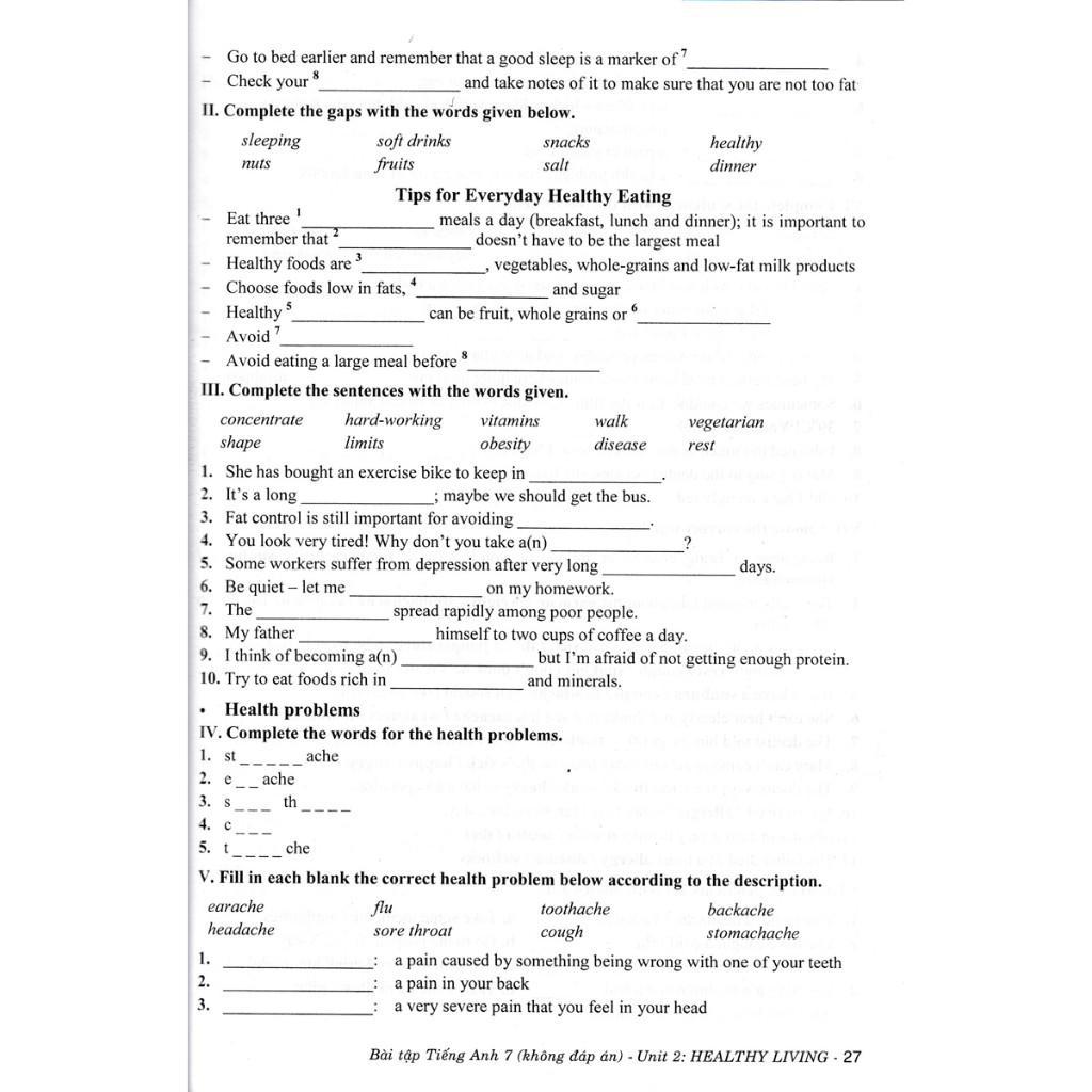 Bài tập dành cho mỗi đơn vị bài học gồm 6 phần: Pronunciation, Vocabulary, Grammar, Speaking, Reading, Writing, và một bài ôn tập dưới dạng Test gồm 80 câu hỏi kiểm tra với bài tập phát triển các kỹ năng trên.
