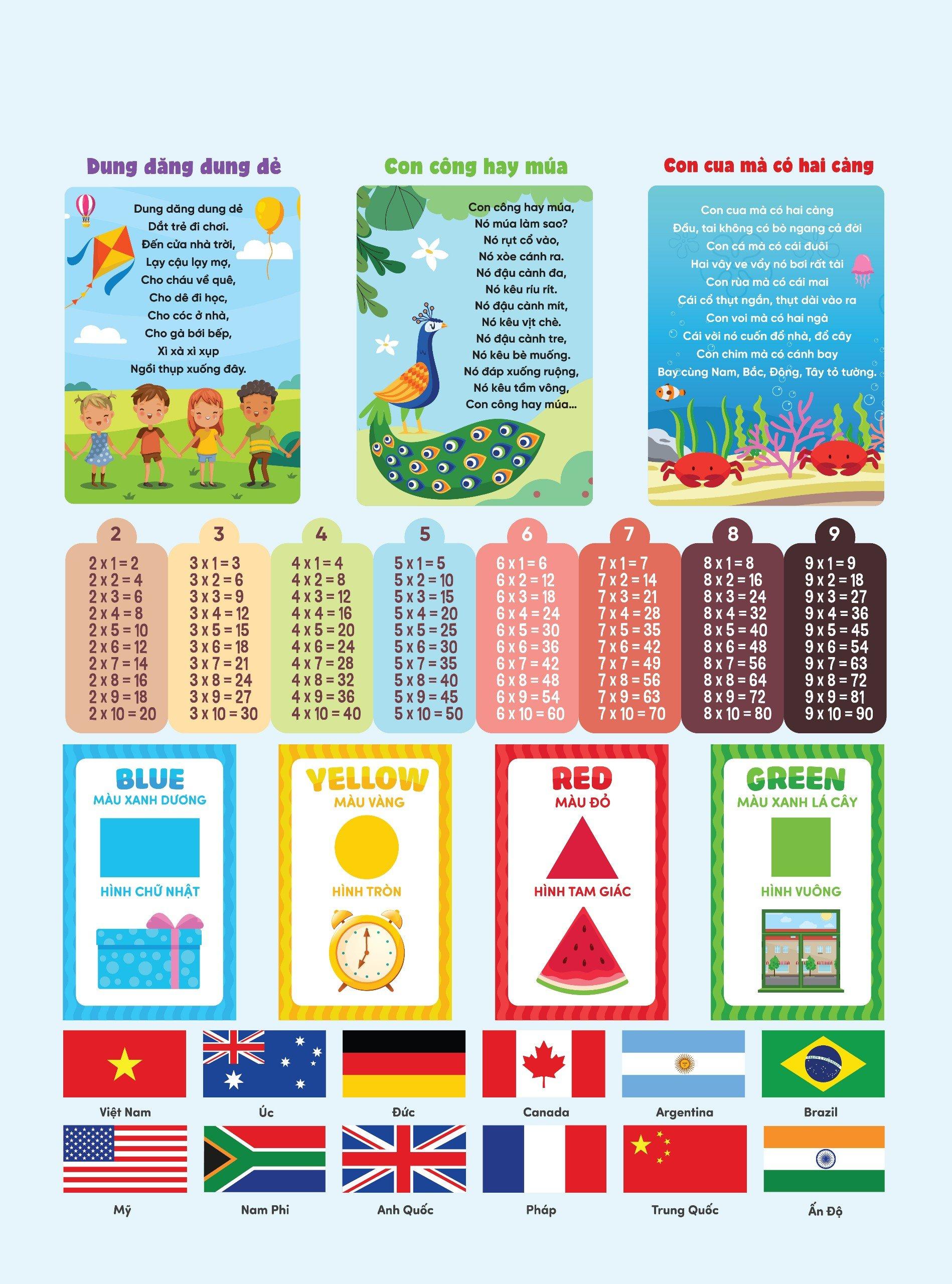 Mỗi bảng bao gồm hai trang. Trên mỗi bảng đều có một trang kiến thức chung, với nội dung giống nhau xoay quanh các kiến thức hữu ích cho trẻ như bảng cửu chương từ 2-9, hình dạng và màu sắc cơ bản bằng cả tiếng Anh&Việt, 3 bài đồng dao tiếng Việt và 12 quốc kì. Trên mặt còn lại là bảng âm thanh theo từng chủ đề: