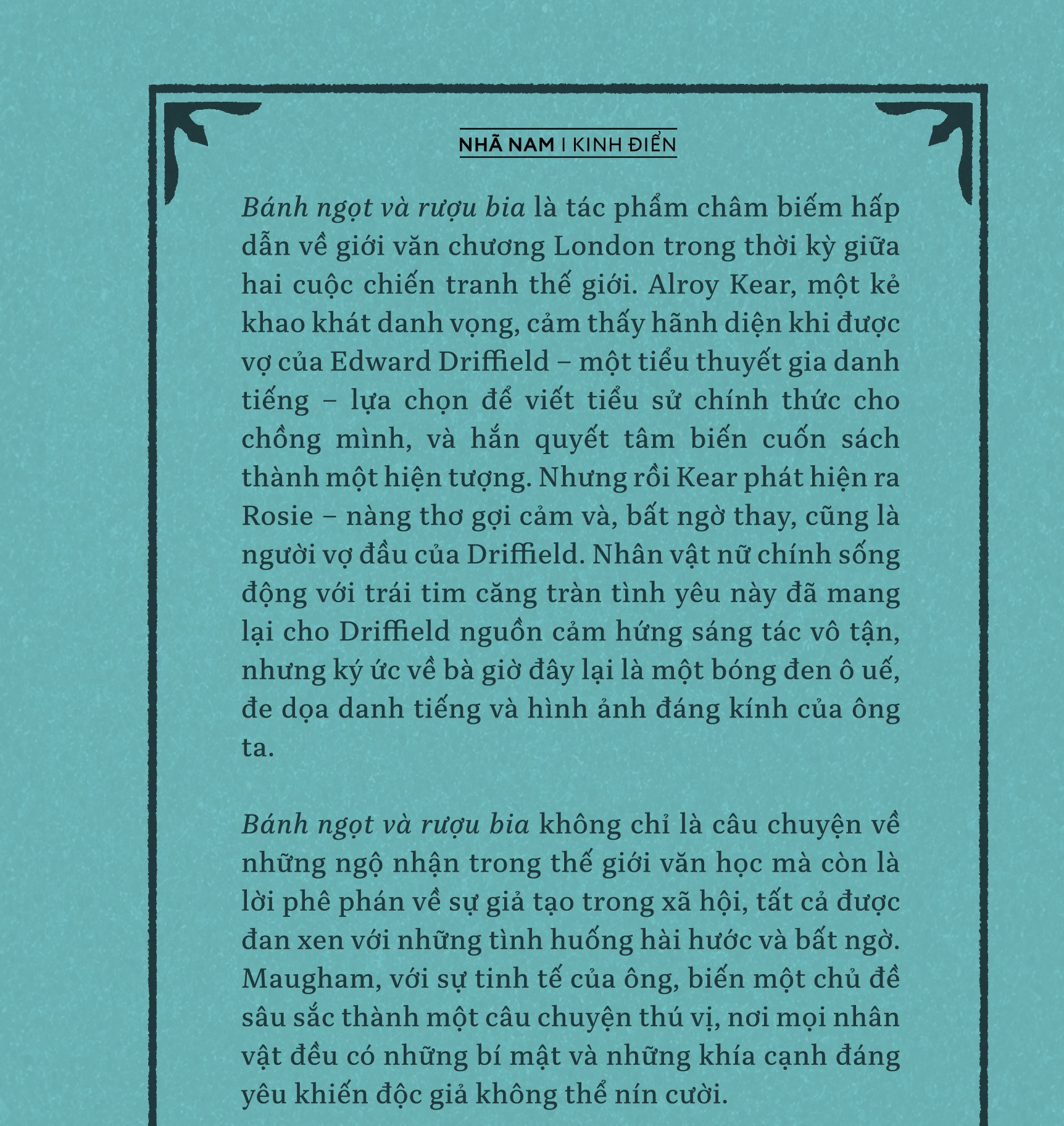 Bánh ngọt và rượu bia không chỉ là câu chuyện về những ngộ nhận trong thế giới văn học mà còn là lời phê phán về sự giả tạo trong xã hội, tất cả được đan xen với những tình huống hài hước và bất ngờ. Maugham, với sự tinh tế của ông, biến một chủ đề sâu sắc thành một câu chuyện thú vị, nơi mọi nhân vật đều có những bí mật và những khía cạnh đáng yêu khiến độc giả không thể nín cười.
