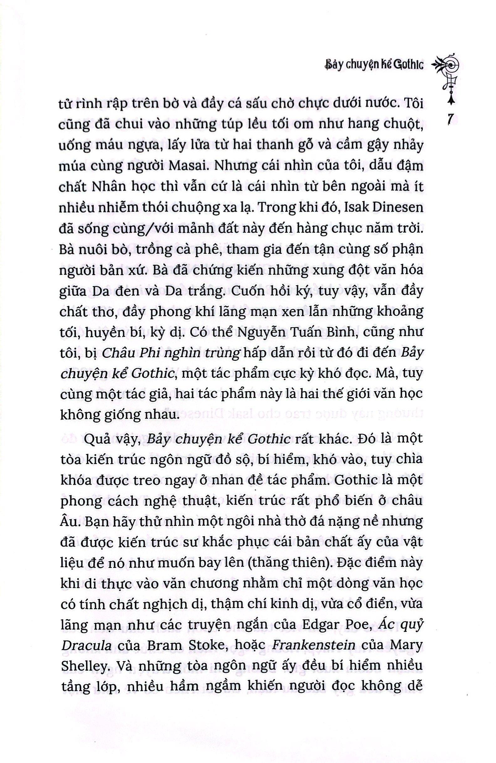 Khi nhắc tới nhà văn Đan Mạch Isak Dinesen, chắc hẳn bạn đọc Việt Nam sẽ nghĩ ngay tới “Châu Phi nghìn trùng” nổi tiếng – cuốn hồi ký của bà về 17 năm sống ở châu Phi – qua bản dịch ngọt ngào của dịch giả Hà Thế Giang. Nhưng có lẽ ít bạn đọc biết rằng chính tác phẩm đầu tay “Bảy chuyện kể Gothic” xuất bản năm 1934 ở Mỹ đã đưa Isak Dinesen trở thành một trong những nhà văn quan trọng nhất thế kỷ XX.
