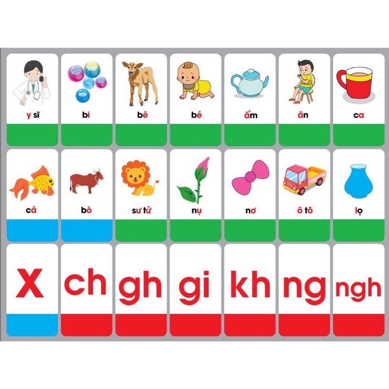 - bộ thẻ học chữ gồm 42 thẻ: 29 chữ cái, 11 chữ ghép, các dấu thanh
