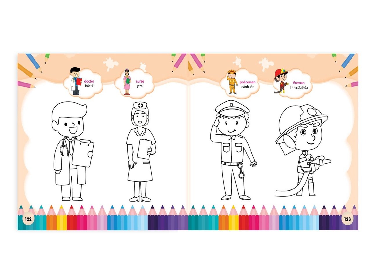 - Cuốn sách tô màu với nhiều hình vẽ chủ đề khác nhau, gần gũi với cuộc sống xung quanh bé. Bé có thể thỏa sức phối màu sắc tạo những bức tranh sinh động