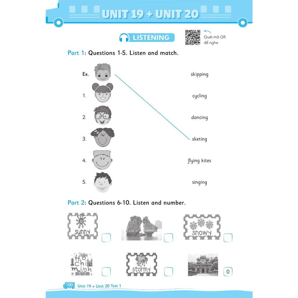 Cứ hai bài sẽ có 2 bài kiểm tra, tất cả các bài kiểm tra đều được thiết kế theo quy định thông tư mới nhất về kiểm tra môn Tiếng Anh tiểu học.