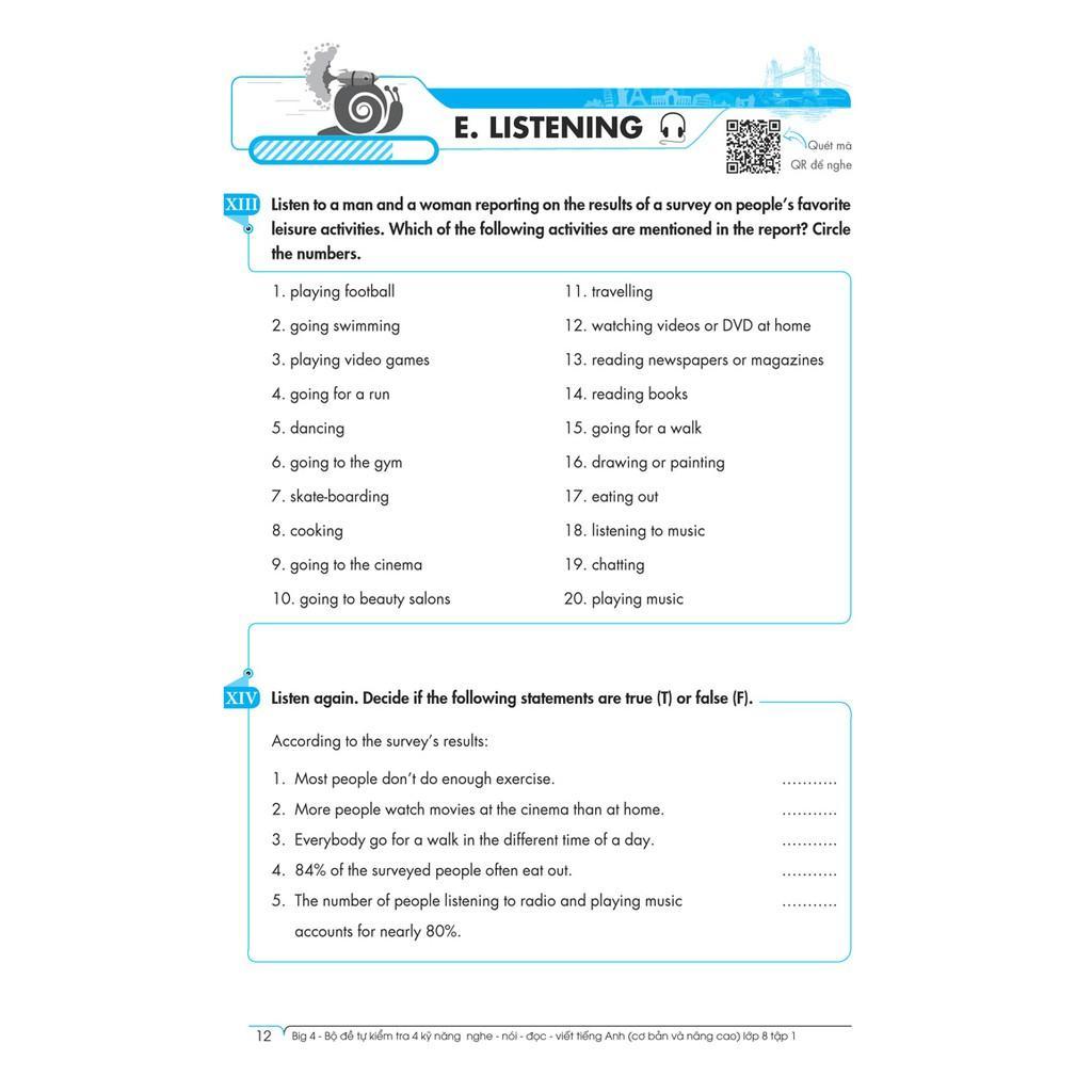 Big 4 Bộ Đề Tự Kiểm Tra 4 Kỹ Năng Nghe – Nói – Đọc – Viết (Cơ Bản và Nâng Cao) Tiếng Anh Lớp 8 Tập 1 viết theo chuẩn khung chương trình mới của Bộ Giáo Dục và Đào Tạo giúp các em học sinh lớp 8 củng cố và phát triển toàn diện các kỹ năng: Nghe – Nói – Đọc – Viết Tiếng Anh.