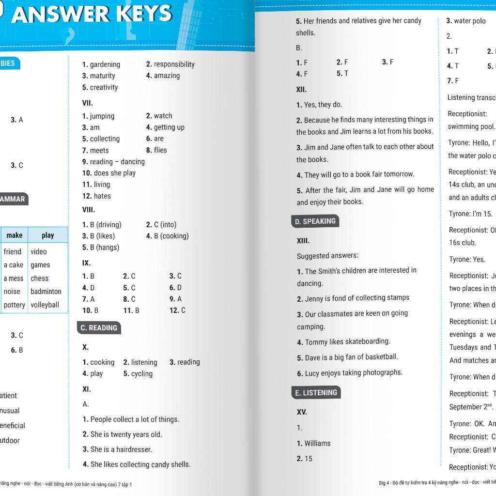 Bộ sách Big 4 - Bộ đề Tự kiểm tra 4 kỹ năng NGHE – NÓI – ĐỌC – VIẾT được biên soạn theo khung chương trình mới của Bộ Giáo dục và Đào tạo nhằm giúp các em học sinh Trung học cơ sở được củng cố và phát triển toàn diện các kỹ năng nghe, nói, đọc, viết tiếng Anh. ĐIỂM NỔI BẬT ĐẶC BIỆT CỦA SÁCH 1. Nội dung được biên soạn một cách khoa học, theo khung chương trình mới nhất của Bộ Giáo dục và Đào tạo Big 4 - Bộ đề Tự kiểm tra 4 kỹ năng NGHE – NÓI – ĐỌC – VIẾT được biên soạn theo chương trình mới của Bộ Giáo Dục và Đào Tạo. Đây là nguồn tài liệu hữu ích cho giáo viên, phụ huynh và các em học sinh bên cạnh bộ sách giáo khoa cơ bản. Cấu trúc của mỗi Unit gồm 6 phần A. Phonetics B. Vocabulary And Grammar C. Reading D. Speaking E. Listening F. Writing 2. Bài tập rèn luyện đa dạng, cơ bản và nâng cao Bài tập được phân chia theo 2 cấp độ, cơ bản và nâng cao. Hệ thống bài tập luyện 4 kỹ năng cơ bản giúp các em ôn tập kiến thức trên lớp; bài tập mở rộng, nâng cao để các em rèn luyện và làm quen với các kì kiểm tra, đánh giá. Các bài tập về 4 kỹ năng được liên kết với nhau theo logic bài học giúp cảm em cảm thấy tự tin và phát triển toàn diện kỹ năng nghe, nói, đọc, viết tiếng Anh 3. File nghe QR code hiện đại và tiện dụng Một điểm đặc biệt của bộ sách đó là tính hiện đại và sự tiện dụng khi các em không cần sử dụng CD để có được bài nghe. Bộ sách được tích hợp mã QR và mã Code giúp các em dễ dàng có được file nghe chỉ với 1 chiếc smartphone, giúp rút ngắn thời gian tìm file 4. Đáp án chi tiết: Hệ thống lời giải chi tiết, các em có thể dễ dàng kiểm tra và đánh giá năng lực bản thân MegaBook hi vọng rằng bộ sách Big 4 bộ đề tự kiểm tra 4 kỹ năng Nghe - Nói - Đọc - Viết tiếng Anh sẽ làm tăng thêm sự tự tin của các em học sinh với khả năng tiếng Anh của bản thân. Công ty phát hành Megabook