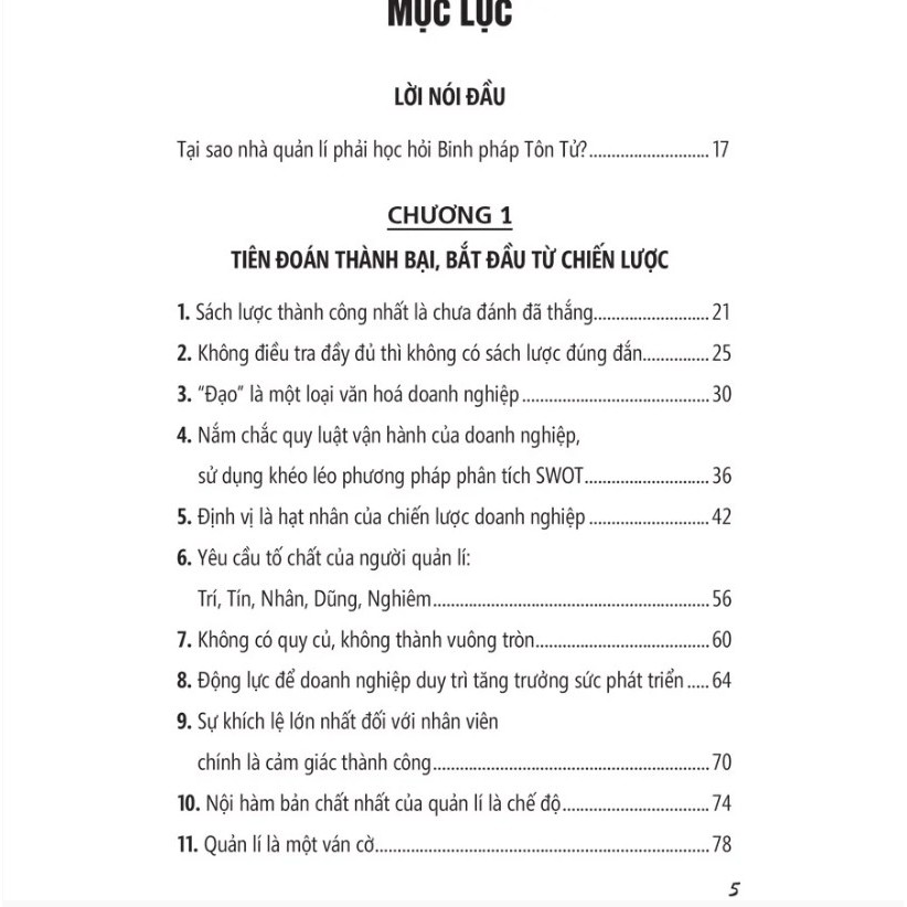 Binh Pháp Tôn Tử Trong Quản Lý Binh pháp Tôn Tử là bộ sách lược về chiến thuật trinh chiến do Tôn Tử biên soạn từ thời Xuân Thu. Đây là một trong những bộ sách hàng đầu khi bàn đến kế hoạch chiến lược và những binh pháp được nhắc đến trong bộ sách cũng được áp dụng linh hoạt trong nhiều lĩnh vực khác nhau. Cuốn sách “Binh Pháp Tôn Tử Trong Quản Lý” sẽ sử dụng các “chiêu thức” này vào công việc quản lý, điều hành doanh nghiệp, giúp xác định phương hướng pháp triển và cách thức đạt được thành công. Tại sao nhà quản lí phải học hỏi Binh pháp Tôn Tử? Trong thời đại kinh doanh ngày nay, cạnh tranh đã không còn đơn thuần là cạnh tranh về vốn, cạnh tranh về tri thức, mà đã nâng lên thành cạnh tranh về trí tuệ tư duy của tầng lớp lãnh đạo các doanh nghiệp. Cho dù là người phương Đông hay phương Tây, chúng ta đều cần có trí tuệ ở tầm sâu hơn và ý thức tư duy ở tầm cao hơn. Binh pháp Tôn Tử là đại diện tiêu biểu của văn hoá Hoa Hạ, chứa đựng vô số trí tuệ triết học phương Đông. Cho đến ngày nay, chúng ta vẫn kinh ngạc và thán phục trước tư tưởng biện chứng trong Binh pháp Tôn Tử, và sự sâu xa rộng lớn của tư duy thái cực của nó. Những gì chúng ta học hỏi được từ Binh pháp Tôn Tử không chỉ là tri thức, mà còn nắm bắt được tinh tuý của phương thức tư duy phương Đông chứa đựng trong đó. Binh pháp Tôn Tử bao trùm vũ trụ, cấu thành mọi hiện tượng trong kinh doanh, dựa vào văn hoá phương Đông để làm sáng tỏ và phát triển một cách toàn diện rất nhiều lí luận kinh doanh của phương Tây hiện đại như quản lí, chiến lược, huy động vốn, hợp tác liên minh, marketing thị trường… Thông qua so sánh tư duy phương Đông và lí luận kinh doanh phương Tây, cuốn sách tiến hành cuộc giao thoa chưa từng có về mặt tư duy; và cuộc so sánh, giao thoa của nền văn hoá Đông Tây này sẽ kích thích tư duy kinh doanh và mô hình sáng tạo của chúng ta từ nhiều góc độ, từ đó càng học hỏi được nhiều hơn, sâu sắc hơn nữa những đạo lí về quản lí trong thời đại kinh doanh mới. Trong cuốn sách Cha giàu, cha nghèo có viết: “Sự giàu có thực sự là một kiểu phương thức tư duy, chứ không phải là gửi bao nhiêu tiền trong ngân hàng”. Tương tự như vậy, điều quan trọng nhất ta học được trong Binh pháp Tôn Tử chính là học tập phương pháp tư duy của cuốn sách, chứ không chỉ dừng lại ở việc hiểu được ý tứ của câu chữ. Sau khi nắm vững tư duy chiến lược, tư duy biện chứng và nguyên tắc cơ bản của nó, dung hoà và thấu hiểu 13 chương, tổng hợp phân tích và lí giải một cách sâu sắc quan điểm tư tưởng trong sách, hấp thu tinh hoa, nắm bắt phong thái của cuốn sách, từ đó chúng ta sẽ tìm ra những gợi ý hữu ích cho việc thúc đẩy thị trường, cạnh tranh giành thắng lợi của mình. Trong quá trình học tập, nghiên cứu Binh pháp