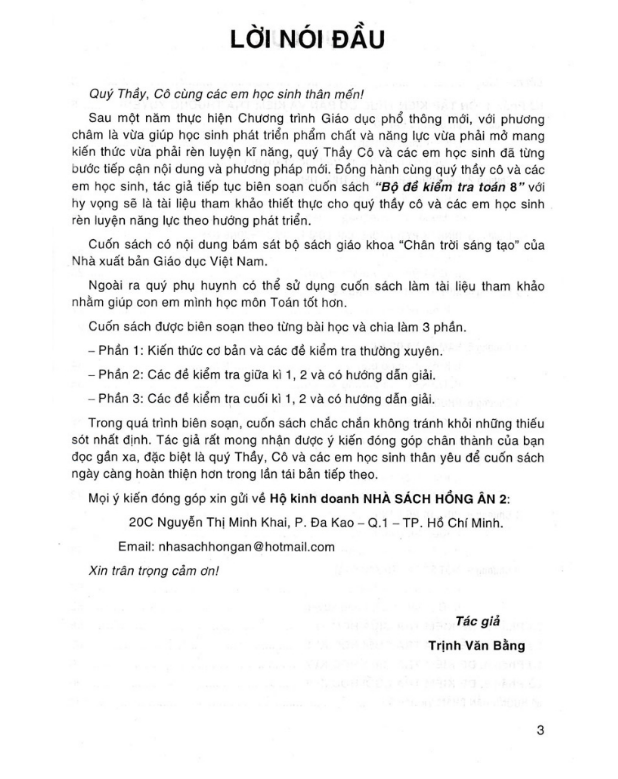 Sau một năm thực hiện Chương trình Giáo dục phổ thông mới, với phương châm là vừa giúp học sinh phát triển phẩm chất và năng lực vừa phải mở mang kiến thức vừa phải rèn luyện kĩ năng, quý Thầy Cô và các em học sinh đã từng bước tiếp cận nội dung và phương pháp mới. Đồng hành cùng quý thầy cô và các em học sinh, tác giả tiếp tục biên soạn cuốn sách “Bộ đề kiểm tra toán 8” với hy vọng sẽ là tài liệu tham khảo thiết thực cho quý thầy cô và các em học sinh rèn luyện năng lực theo hướng phát triển.