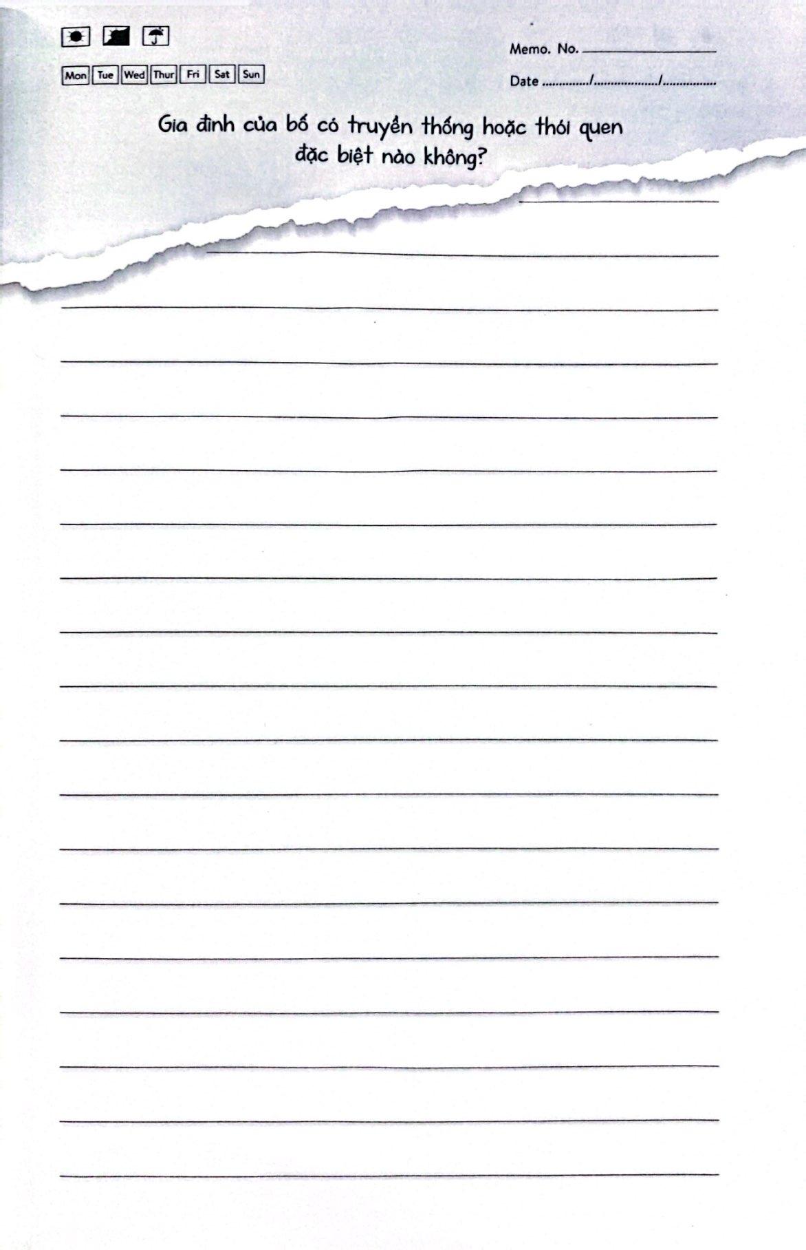 Cuộc đời là hữu hạn, nhưng tình yêu và những câu chuyện bố mẹ để lại là mãi mãi. Tặng họ cuốn sách này là một cách để bạn nói rằng: “Con luôn trân quý thời gian bên bố mẹ và mong được lưu giữ tất cả những gì thuộc về bố mẹ trong trái tim con.”