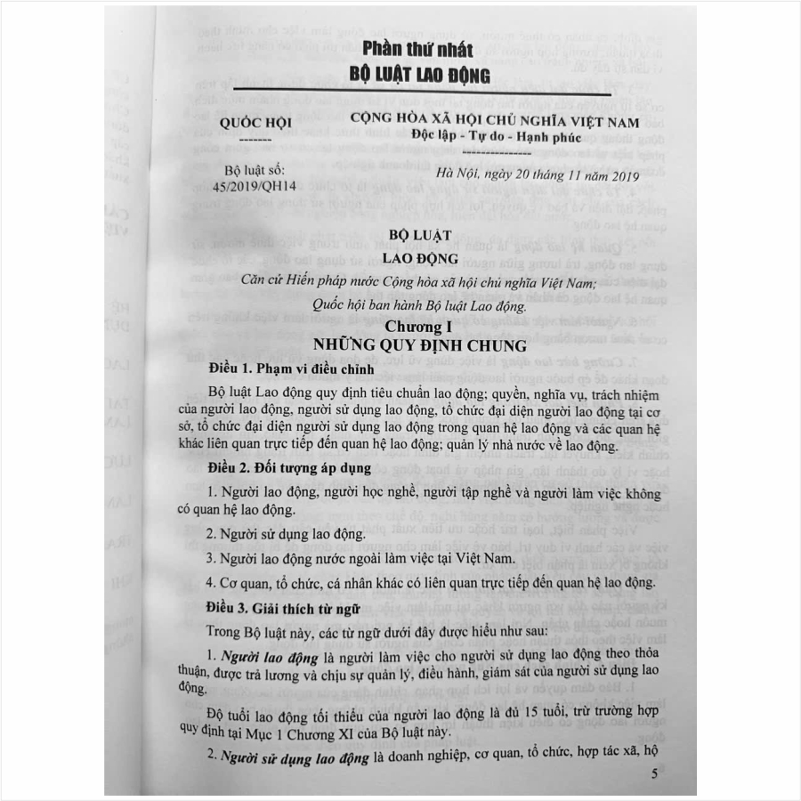 Bộ luật Lao động số 45/2019/QH14 được Quốc hội nước Cộng hòa xã hội chủ nghĩa Việt Nam thông qua ngày 20-11-2019 tại Kỳ họp thứ 8 khóa XIV. Bộ luật này có 17 Chương,