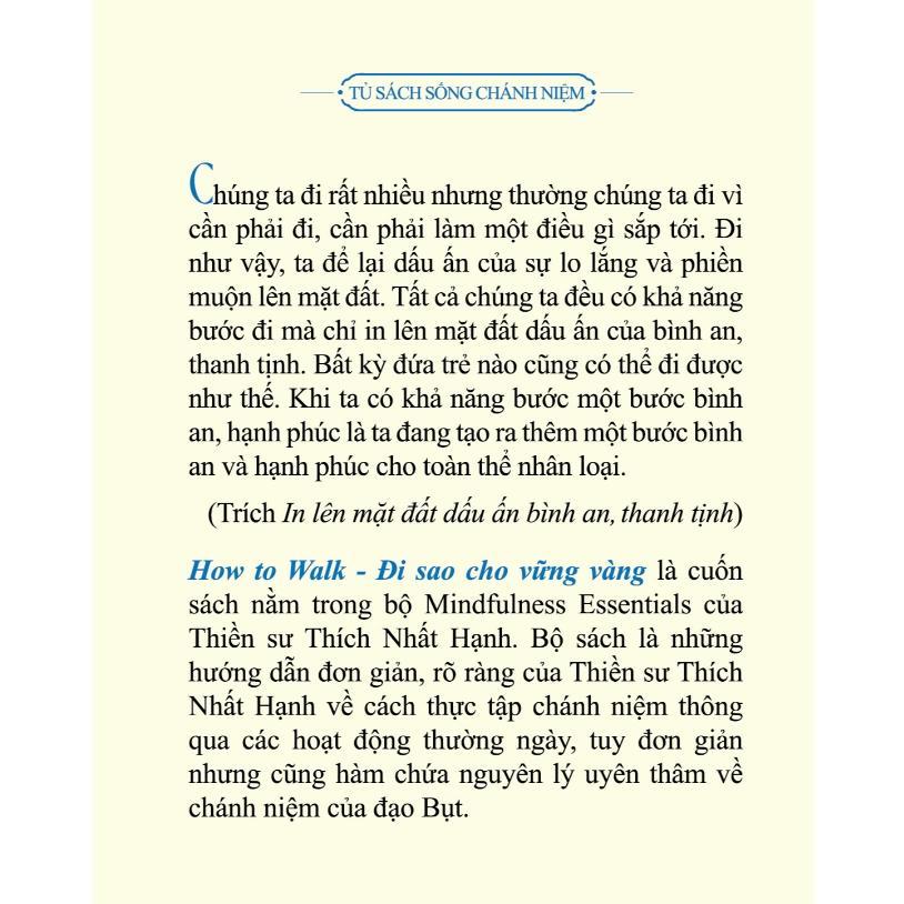 How to walk - Đi sao cho vững vàng là cuốn sách nằm trong bộ Mindfulness Essentials của Thiền sư Thích Nhất Hạnh. Bộ sách là những hướng dẫn đơn giản, rõ ràng của Thiền sư Thích Nhất Hạnh về cách thực tập chánh niệm thông qua các hoạt động thường ngày. Tuy đơn giản, nhưng chúng cũng hàm chứa những nguyên lý uyên thâm về chánh niệm của đạo Bụt.