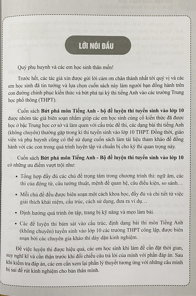 Cuốn sách "Bứt phá môn tiếng anh - Bồ đề luyện thi tuyển sinh vào lớp 10" được nhóm tác giả biên soạn nhằm giúp các em học sinh củng cố kiến thức đã được học ở bậc Trung học cơ sở và làm quen với cấu trúc đề thi, các dạng bài thi tiếng Anh (không chuyên) thường gặp trong kì thi tuyển sinh vào lớp 10 PTTH.