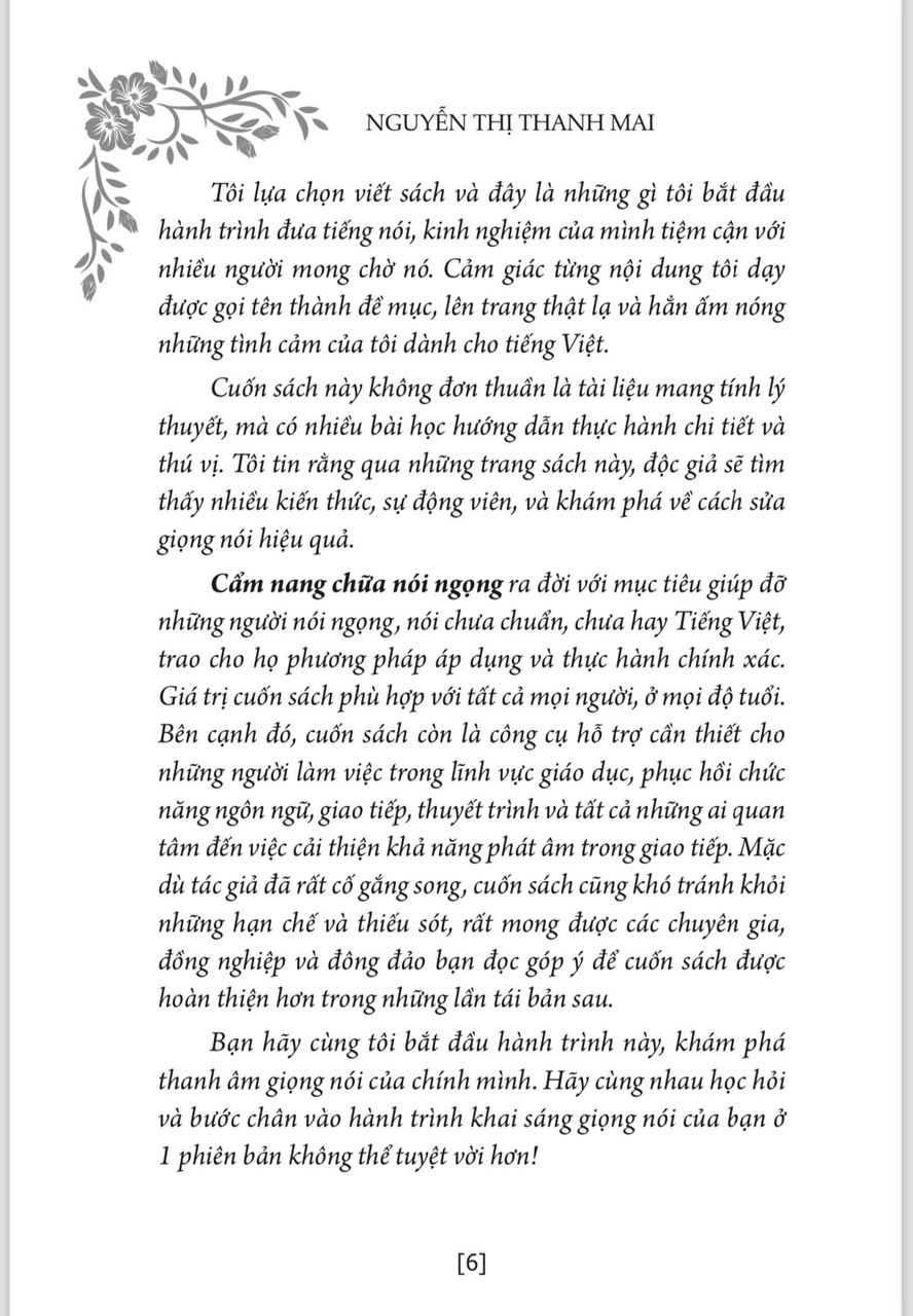 “Cuốn sách này không đơn thuần là tài liệu mang tính lý thuyết mà có nhiều bài học hướng dẫn thực hành chi tiết và thú vị. Tôi tin rằng qua những trang sách, độc giả sẽ tìm thấy nhiều kiến thức, sự động viên và khám phá về cách sửa giọng nói hiệu quả”, MC Thanh Mai nói.