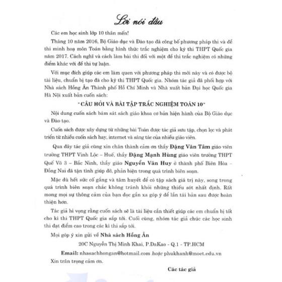 Bộ Giáo Dục và Đào tạo đã công bố phương pháp thi và đề thi minh họa môn Toán bằng hình thức trắc nghiệm cho kỳ thi THPT Quốc gia năm 2017. Với mục đích giúp các em làm quen với phương pháp thi mới này và có được bộ tài liệu, chuẩn bị cho kỳ thi THPT quốc gia thì nhà sách trực tuyến N xin trân trọng giới thiệu đến các em học sinh cũng như quý thầy cô, cùng các bậc phụ huynh cuốn sách Câu Hỏi Và Bài Tập Trắc Nghiệm Toán 10.