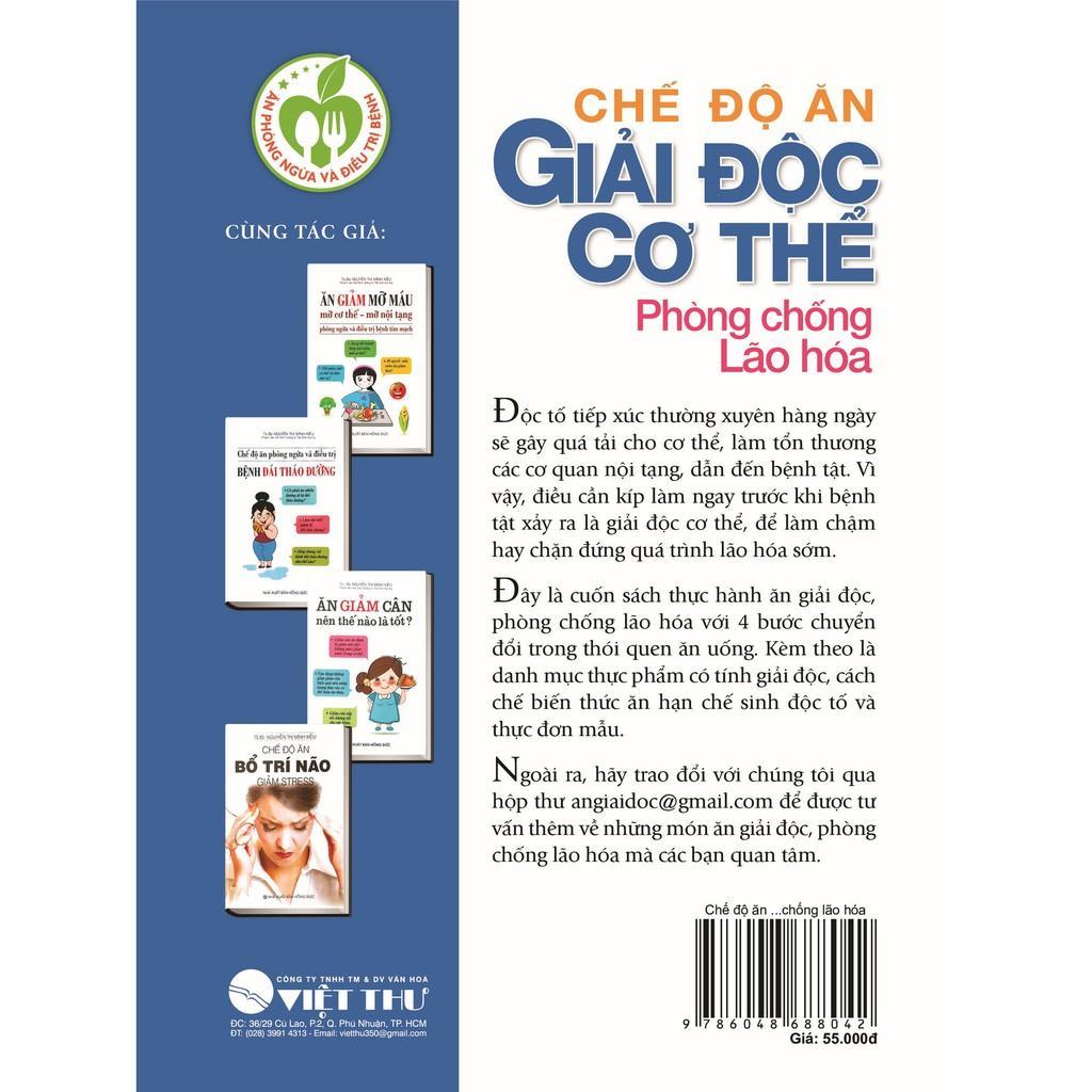 Chế Độ Ăn Giải Độc Cơ Thể Phòng Chống Lão Hóa là cuốn sách hướng dẫn thực hành ăn giải độc, phòng chống lão hóa với 4 bước chuyển đổi trong thói quen ăn uống. Kèm theo là danh mục thực phẩm có tính giải độc, cách chế biến thức ăn hạn chế sinh độc tố và thực đơn mẫu.