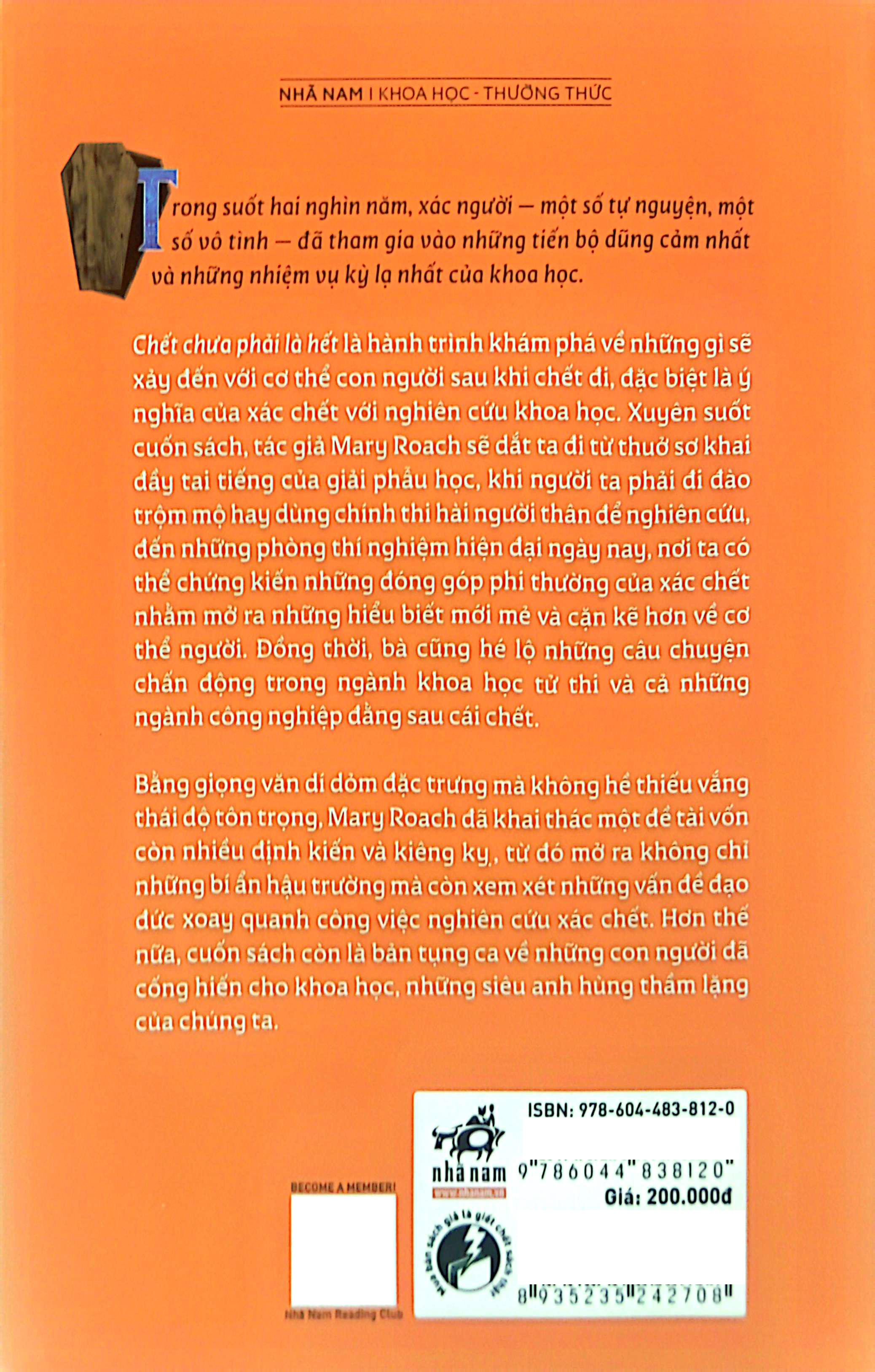 Chết chưa phải là hết là hành trình khám phá về những gì sẽ xảy đến với cơ thể con người sau khi chết đi, đặc biệt là ý nghĩa của xác chết với nghiên cứu khoa học. Xuyên suốt cuốn sách, tác giả Mary Roach sẽ dắt ta đi từ thuở sơ khai đầy tai tiếng của giải phẫu học, khi người ta phải đi đào trộm mộ hay dùng chính thi hài người thân để nghiên cứu, đến những phòng thí nghiệm hiện đại ngày nay, nơi ta có thể chứng kiến những đóng góp phi thường của xác chết nhằm mở ra những hiểu biết mới mẻ và cặn kẽ hơn về cơ thể người. Đồng thời, bà cũng hé lộ những câu chuyện chấn động trong ngành khoa học tử thi và cả những ngành công nghiệp đằng sau cái chết.