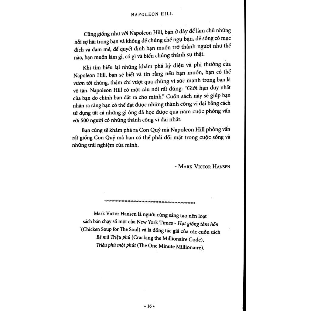 Cuốn sách là cuộc trò chuyện của Napoleon Hill và Con Quỷ. Sau bao nhiêu năm miệt mài nghiên cứu cuối cùng ông cũng phát hiện ra Con Quỷ, bắt nó phải thú tội và tiết lộ những sự thật kinh hoàng về nơi nó sống, cách nó kiểm soát tâm trí con người và cách để con người chiến thắng được nó. Khi đọc cuốn sách này, có thể bạn sẽ tự hỏi, cuộc trò chuyện này có thật không? Con Quỷ là có thật hay là một sản phẩm của trí tưởng tượng của Napoleon Hill. Nhưng quyền lựa chọn cách hiểu vấn đề là của bạn. Bởi lẽ cuối cùng, thông qua cuộc trò chuyện với Con Quỷ, Napoleon Hill đã cung cấp cho chúng ta chìa khóa để chiến thắng Con Quỷ trong cuộc sống riêng của mỗi người.
