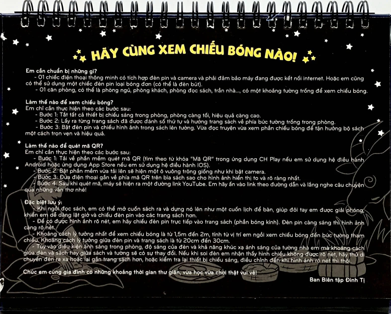 Nằm trong dự án "Người Việt viết sách cho trẻ em Việt", loạt Sách chiếu bóng do Đinh Tị Books phát hành đã gây ấn tượng mạnh mẽ với độc giả bởi sự độc đáo của mình. Với nỗ lực không ngừng của đội ngũ Sản xuất Đinh Tị Books, bộ Sách chiếu bóng thần kỳ phiên bản màu nâng cấp một lần nữa sẽ đưa các em đến với thé giới cổ tích bằng sự lung linh, kỳ ảo. Mỗi trang sách đều có kết cấu đặc biệt, chỉ cần dùng đèn pin chiếu qua, các hình ảnh với màu sắc sống động sẽ được phóng đại trên "màn chiếu" (tường nhà, trần nhà, cánh cửa...) tạo nên những bức tranh sinh động, khiến màn đêm vốn đáng sợ với các bạn nhỏ bỗng trở nên rực rỡ, thân thương. Không những thế, các câu chuyện trong sách đều được kể lại bằng thơ dưới dạng song ngữ, giúp các em vừa dẽ nhớ vừa có thẻ trau dồi thêm khả năng tiếng Anh một cách dễ dàng. Em hãy bật đèn pin chiếu những "thước phim" sống động lên tường để thấy cả thế giới diệu kỳ hiện lên trước mắt nhé!