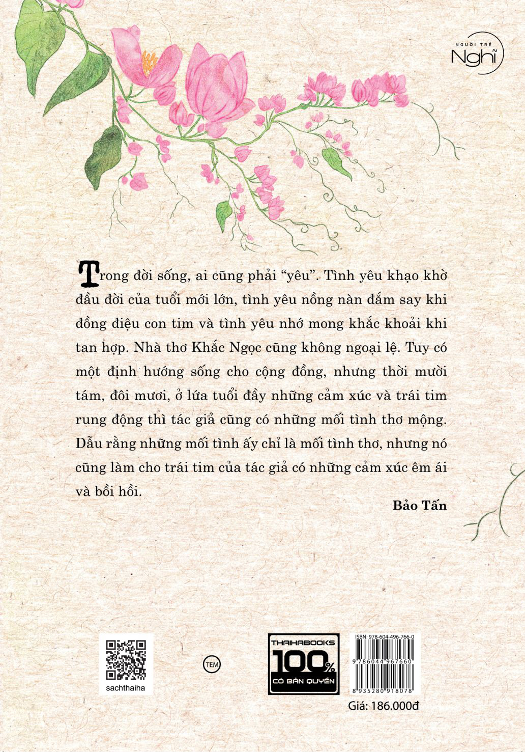 Trong đời sống, ai cũng phải “yêu”. Tình yêu khạo khờ đầu đời của tuổi mới lớn, tình yêu nồng nàn đắm say khi đồng điệu con tim và tình yêu nhớ mong khắc khoải khi tan hợp. Nhà thơ Khắc Ngọc cũng không ngoại lệ. Tuy có một định hướng sống cho cộng đồng, nhưng thời mười tám, đôi mươi, ở lứa tuổi đầy những cảm xúc và khi trái tim rung động thì tác giả cũng có những mối tình thơ mộng. Dẫu rằng những mối tình ấy chỉ là mối tình thơ, nhưng nó cũng làm cho trái tim của tác giả có những cảm xúc êm ái và bồi hồi.
