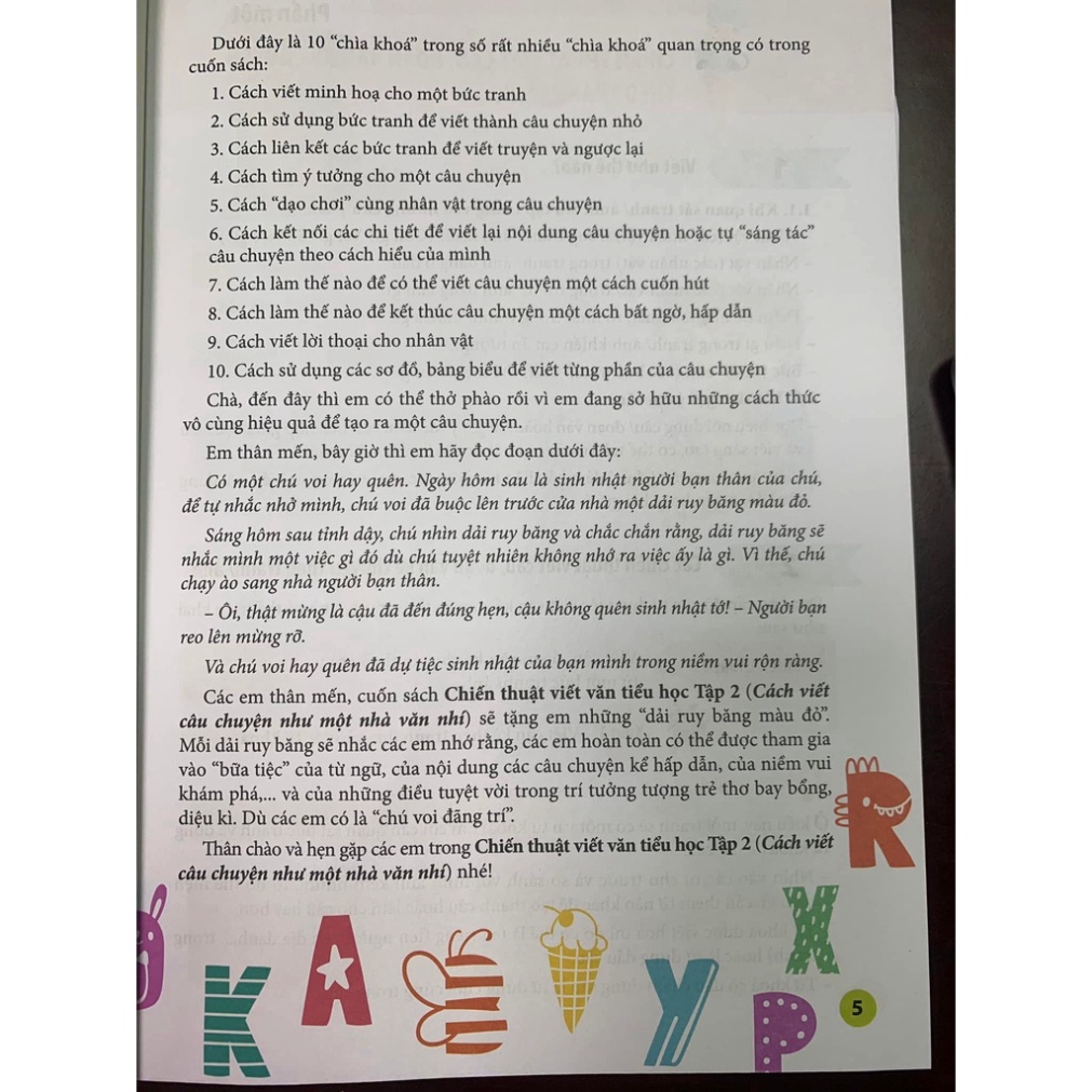 Khi miêu tả cây cối, chúng ta thường nghĩ chắc chắn là cần tả từ rễ, thân, lá, hoa, quả mà không biết có nhiều cách viết tùy thuộc vào điểm nhìn cũng như càm xúc khi miêu tả.Hay khi miêu tả một người, nhất định chỉ tả ngoại hình, hoạt động và tính cách mà không biết có cả những cách tả rất đặc biệt và có cả "đặc tả".Cứ thế, chúng ta thường "nhốt" các ý tưởng, các cách viết văn sáng tạo bằng "những sợi xích"!Cuốn “Chiến thuật viết văn tiểu học” sẽ góp phần gỡ bỏ những khuôn mẫu gò bó, khô cứng đó bằng cách đa dạng hóa các phương thức miêu tả, kể chuyện, từng bước phát triển năng lực tưởng tượng và sáng tạo của trẻ.Trong cuốn sách này, các "chiến thuật" viết văn được trình bày lần lượt thành các phần: