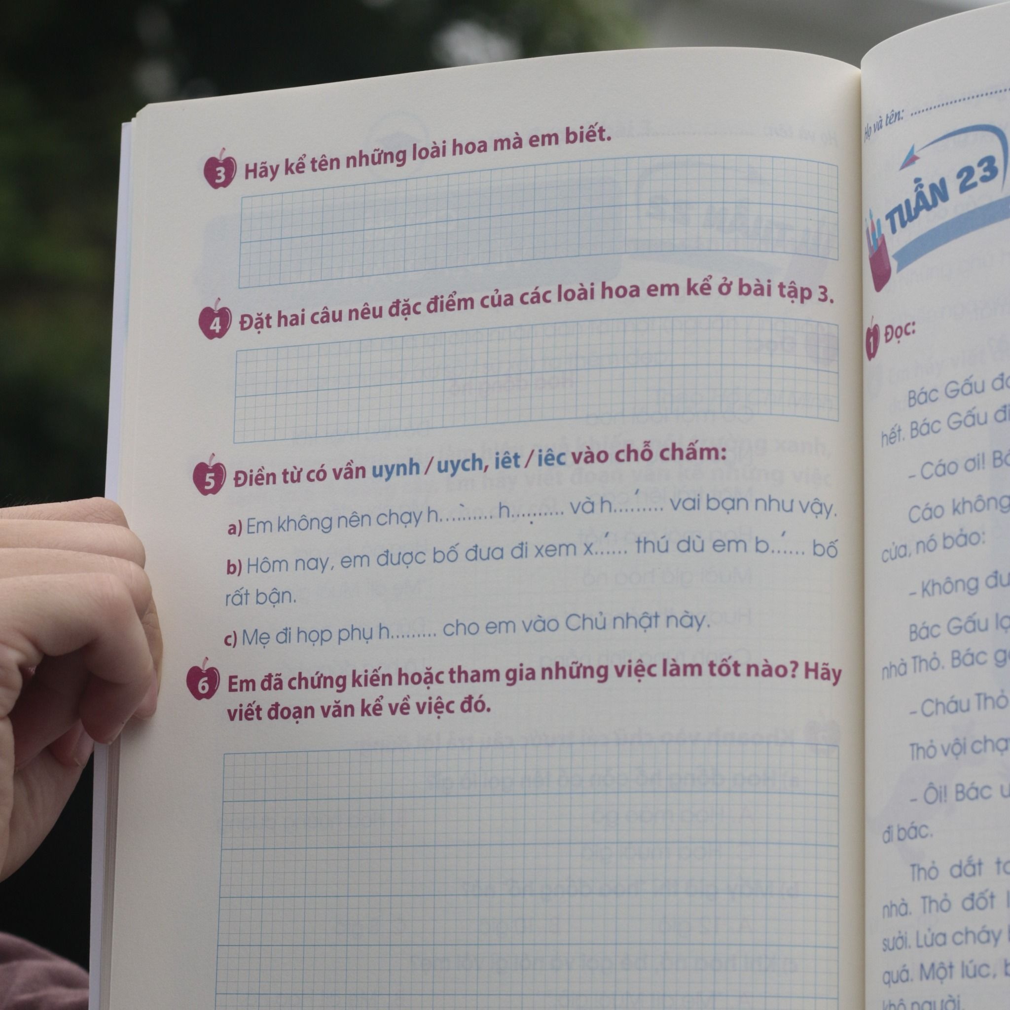 Mỗi phiếu trong cuốn sách sẽ tương ứng với nội dung một tuần học trên lớp của các em. Các em sẽ được tiếp thu các kiến thức về từ, câu, dấu câu... và viết đoạn văn theo chủ đề nhằm rèn luyện kĩ năng đọc, viết, từ , từ viết đúng đến viết hay và sáng tạo.