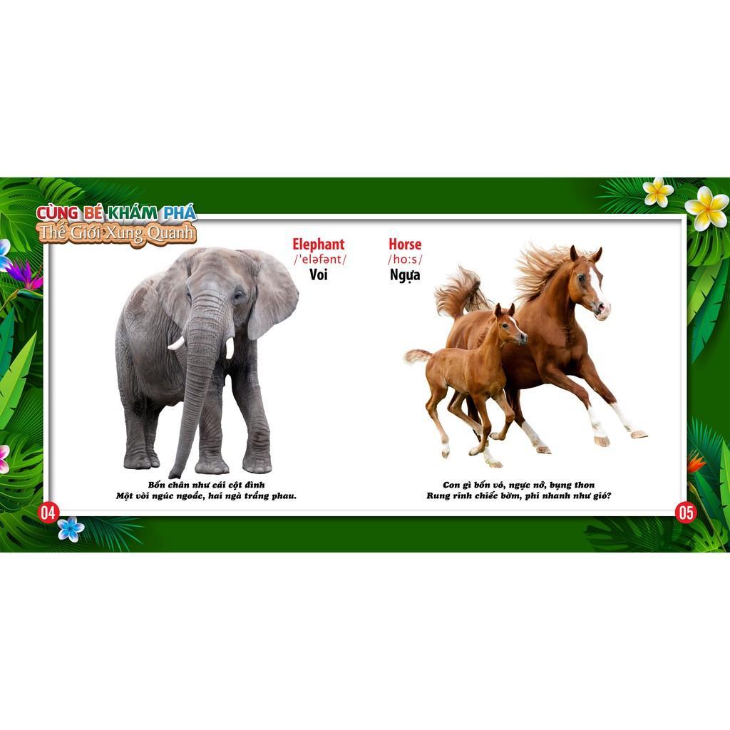 Bộ sách “Cùng bé khám phá thế giới xung quanh” là bộ sách song ngữ vì thế sẽ giúp trẻ làm quen với tiếng Anh, phát triển tư duy khái niệm về đồ vật, động vật, hoa, thế giới … phát triển ngôn ngữ, tình cảm xã hội…
