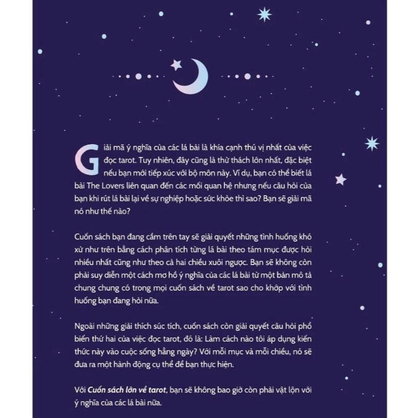 Mô tả: Cuốn Sách Lớn Về Tarot của Sam Magdaleno giải mã ý nghĩa 78 lá bài tarot theo tám mục phổ biến (như tình yêu, sự nghiệp, sức khỏe) và cả hai chiều xuôi-ngược, giúp người mới vượt qua thách thức giải mã. Sách cung cấp giải thích súc tích, hành động cụ thể áp dụng vào cuộc sống hàng ngày, loại bỏ sự mơ hồ khi áp dụng ý nghĩa chung vào tình huống cá nhân.