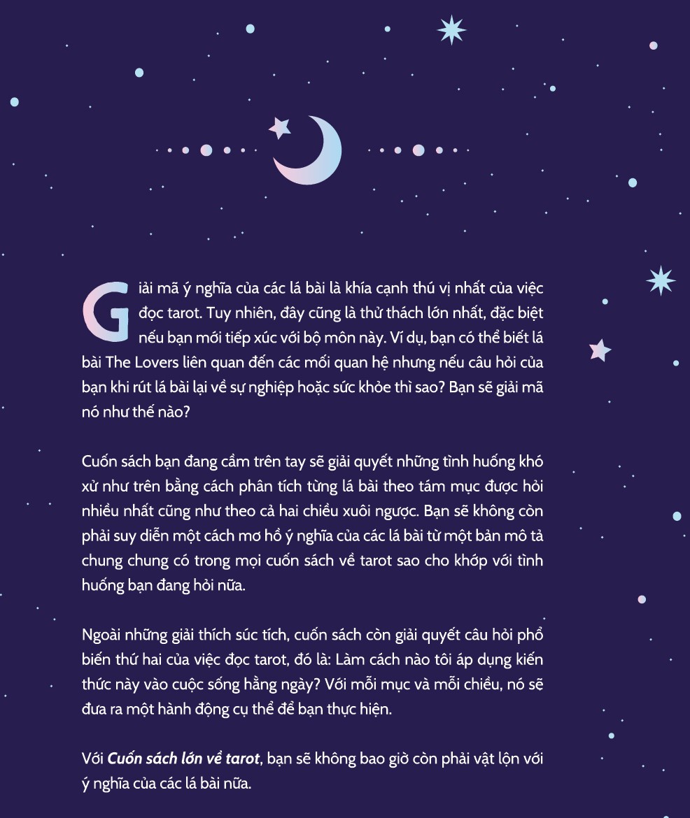 Cuốn sách bạn đang cầm trên tay sẽ giải quyết những tình huống khó xử như trên bằng cách phân tích từng lá bài theo tám mục được hỏi nhiều nhất cũng như theo cả hai chiều xuôi ngược. Bạn sẽ không còn phải suy diễn một cách mơ hồ ý nghĩa của các lá bài từ một bản mô tả chung chung có trong mọi cuốn sách về tarot sao cho khớp với tình huống bạn đang hỏi nữa.